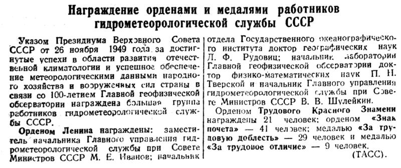 Указом Президиума Верховного Совета СССР от 26 ноября 1949 года за достигнутые успехи в области развития отечественной климатологии и успешное обеспечение метеорологическими данными народного хозяйства и вооруженных сил страны в связи со 100-летием Главной геофизической обсерватории награждена большая группа работников гидрометеорологической службы СССР.