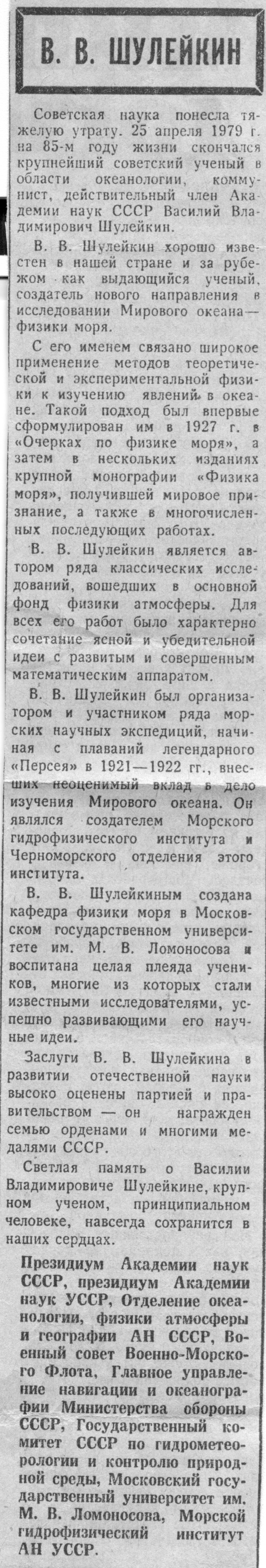 Советская наука понесла тяжелую утрату. 25 апреля 1979 г. на 85-м году жизни скончался крупнейший советский ученый в области океанологии, коммунист, действительный член Академии наук СССР Василий Владимирович Шулейкин.