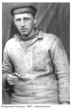полярной экспедиции на «Малыгине» (из Москвы в Архангельск). Ехали в теплушке. Я комендант. Одеты мы в робы и грязны ужасно. В Ярославле на Всполье приходим в три часа ночи на питательный пункт. Там — сонное царство. Мы, матросы, скандалим. Наконец вылезает заспанный заведующий в белье, накинув шинель. «Давай документы». Я кидаю на стол наши бумаги. Он жмётся от холода и, позёвывая, читает: «Предъявитель сего военмор Голицын… Голицын… Го- ли-цын… Такие князья есть?» Мы смеёмся. — «Ну да, это и есть настоящий бывший князь», — говорит Вовка В. Заведующий осматривает меня с ног до головы. Я стою в грязнейшей и рванейшей робе. «Ну и князь! Дать им по три обеда сразу!» (Обед заключается в ухе из снетков. Мы видели, как кидали в котел глыбы льда со снетками, водорослями, лягушками и пр. Очень вкусно)