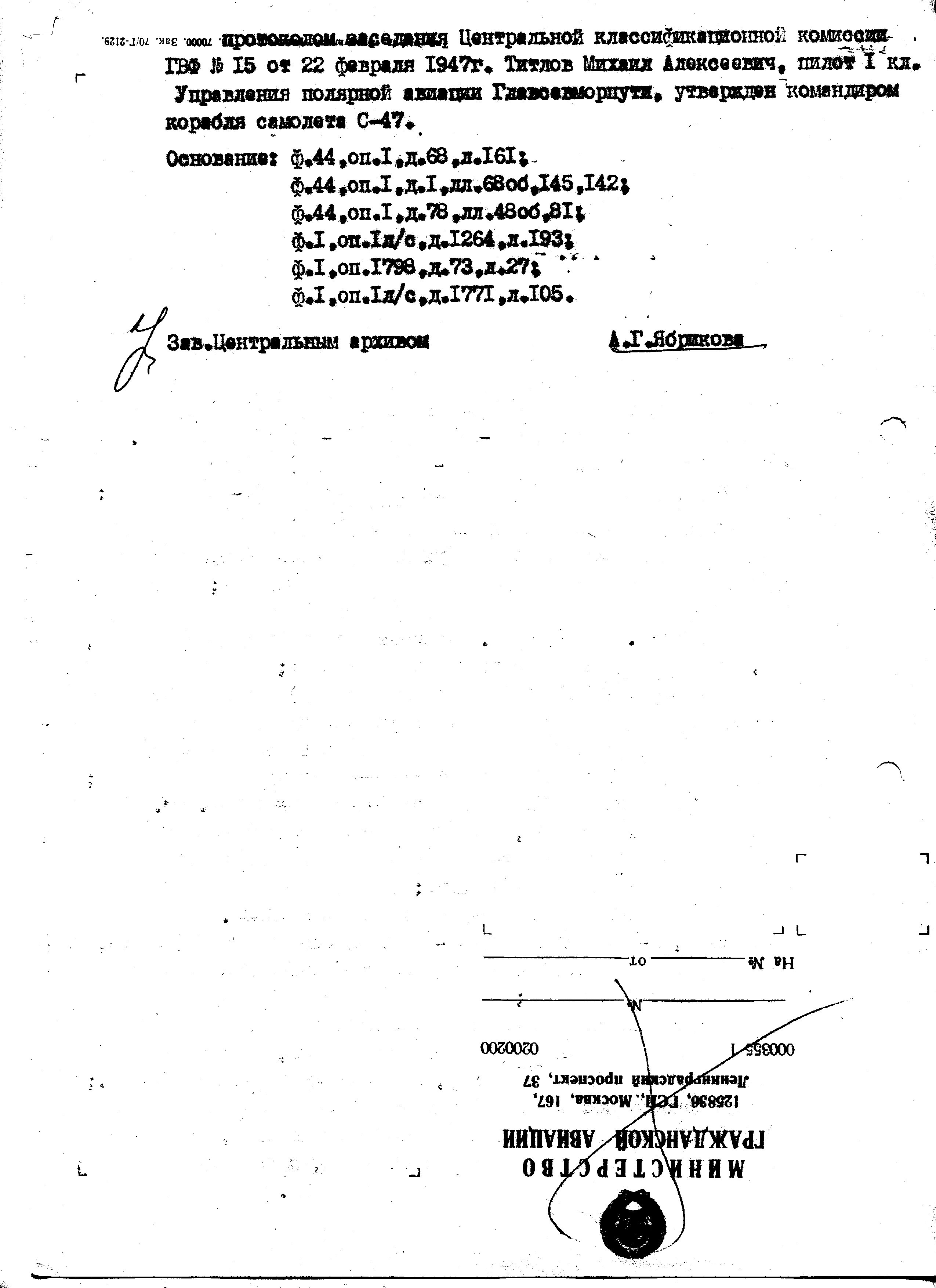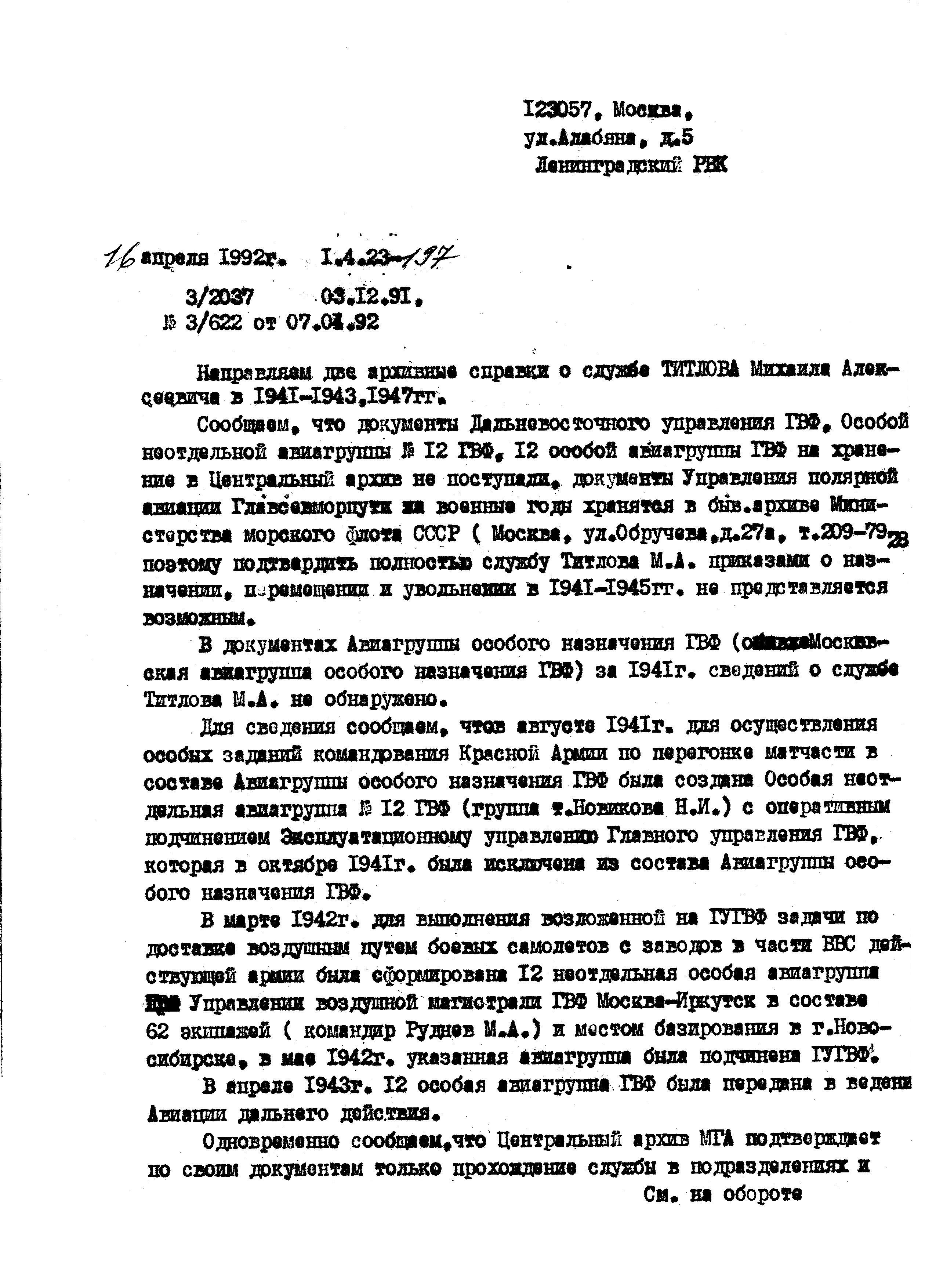 Сообщаем, что документы Дальневосточного управления ГВФ, Особой неотдельной авиагруппы № 12 ГВФ, 12 особой авиагруппы ГВФ на хранение в Центральный архив не поступали, документы Управления полярной авиации Главсевморпути за военные годы хранятся в быв.архиве Министерства морского флота СССР (Москва, ул. Обручева, д.27а, т.209-7928 поэтому подтвердить полностью службу Титлова М.А. приказами о назначении, перемещении и увольнении в 1941-1945гг. не представляется