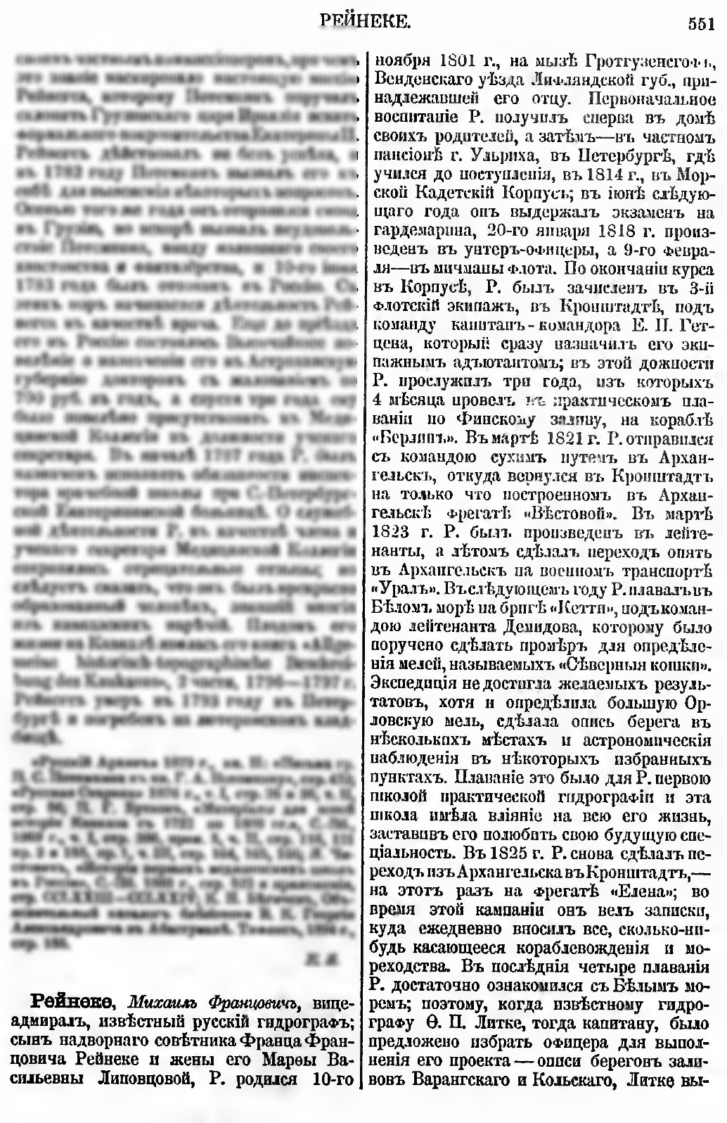Рейнеке, Михаил Францевич (10.11.1801–17.04.1859), вице-адмирал, известный русский гидрограф. Сын надворного советника Франца Францевича Рейнеке (27.01.1746–07.02.1821) и жены его Марфы Васильевны урожд. Липовцовой (ум. 23.10.1830). Отец М.Ф. – Франц – был сыном выборгского бургомистра юстиции, который впоследствии перешел в Ригу советником надворного суда. Родоначальником фамилии Рейнеке считался Франц Авраам фон Рейнеке, венденский уездный судья. Франц Францевич родился в Выборге, учился в сухопутном кадетском корпусе, служил в Ростовском пехотном полку (с 1759) и вышел в отставку в чине секунд-майора. Он участвовал в русско-турецкой войне и был ранен в левое плечо, грудь и правую ногу. Затем Франц Францевич перешел в гражданскую службу и в 1779 был назначен начальником Камчатки. В апреле 1780 он женился на дочери артиллерийского капитана М. В. Липовцовой и переехал на Камчатку, где жил попеременно то в Большерецке, то в Нижне-Камчатске (1780–1786). Он оставил по себе память строгого начальника. Его заслугой было распространение картофелеводства во вверенной ему области. С 1786 – Франц Рейнеке находится в Иркутске, а с 1798 – выходит в отставку и с гражданской службы, после чего отправляется в Лифляндию, на собственную мызу Гротгузенсгоф Венденского уезда, где 10 ноября 1801 родился его самый младший сын – Михаил Францевич. Всего в семье было 6 сыновей и 5 дочерей, из которых три дочери умерли еще в Сибири. Известны следующие представители семьи Рейнеке: Анна Францевна, вышедшая замуж за Потемкина еще в Сибири, Наталья Францевна, Василий, Николай, Адриан, Александр, Павел и Михаил Францевичи. Судьба Адриана и Александра была связана с военной службой – первый служил офицером при арестантских ротах и вышел в отставку в чине капитана, второй стал моряком, командовал обороной Свеаборга во время Крымской войны и был уволен с чином генерал-майора (1855). У Адриана было два сына – Николай и Константин, у Александра – четыре дочери. Павел Францевич принимал участие в путешествиях своего брата Михаила и помогал при проведении гидрографических работ.