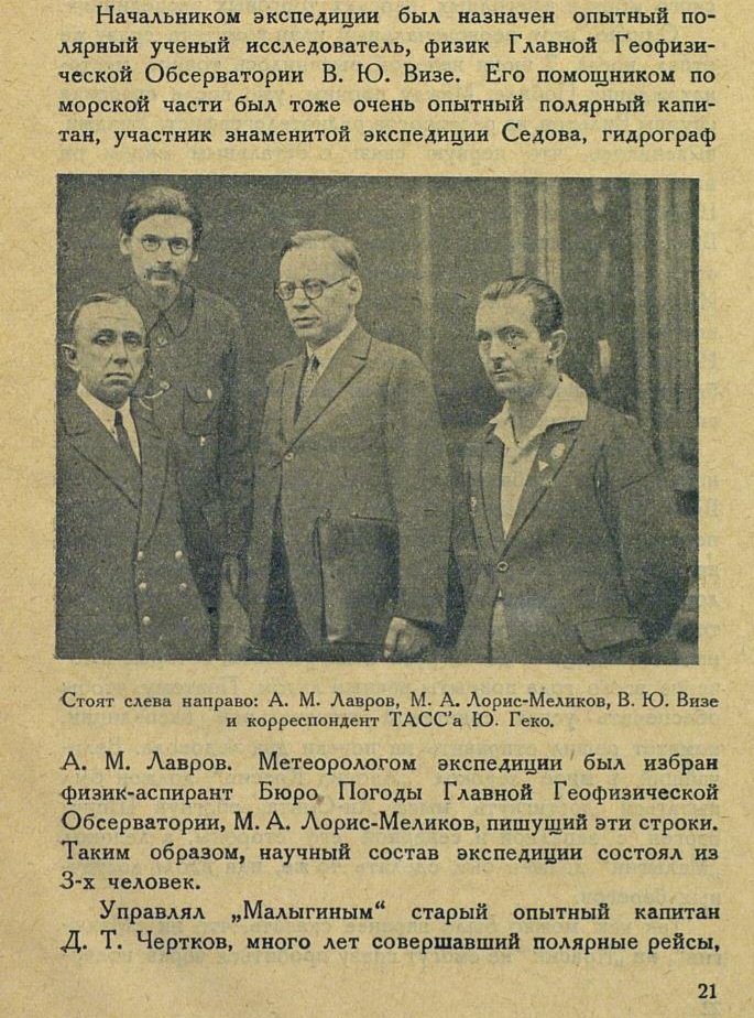Лорис-Меликов М.А. На "Малыгине" в полярных льдах С 5 фотоснимками и карт. / М. А. Лорис-Меликов метеоролог Вост. спасательной экспедиции. — 2-е изд.. — Ленинград : Красная газета, 1928. — 62 с.