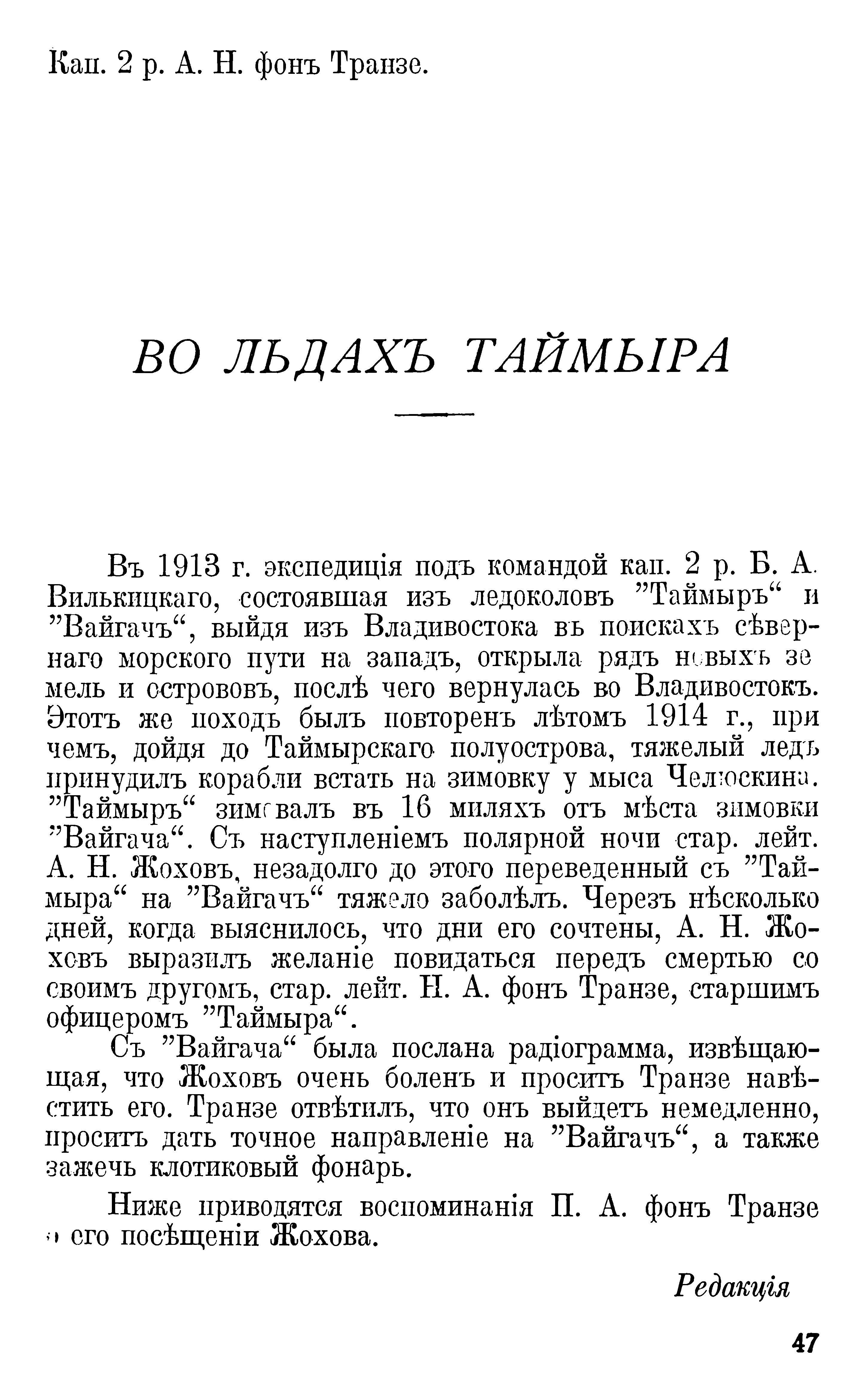 Въ 1913 г. экспедиція подъ командой кап. 2 р. Б. А. Вилькицкаго, состоявшая изъ ледоколовъ ”Таймыръ“ и ”Вайгачъ“, выйдя изъ Владивостока въ поискахъ сѣвернаго морского пути на западъ, открыла рядъ новыхъ земель и острововъ, послѣ чего вернулась во Владивостокъ. Этотъ же походъ былъ повторенъ лѣтомъ 1914 г., при чемъ, дойдя до Таймырскаго полуострова, тяжелый ледь принудилъ корабли встать на зимовку у мыса Челюскина. ”Таймыръ“ зимовалъ въ 16 миляхъ отъ мѣста зимовки ”Вайгача“. Съ наступленіемъ полярной ночи стар. лейт.