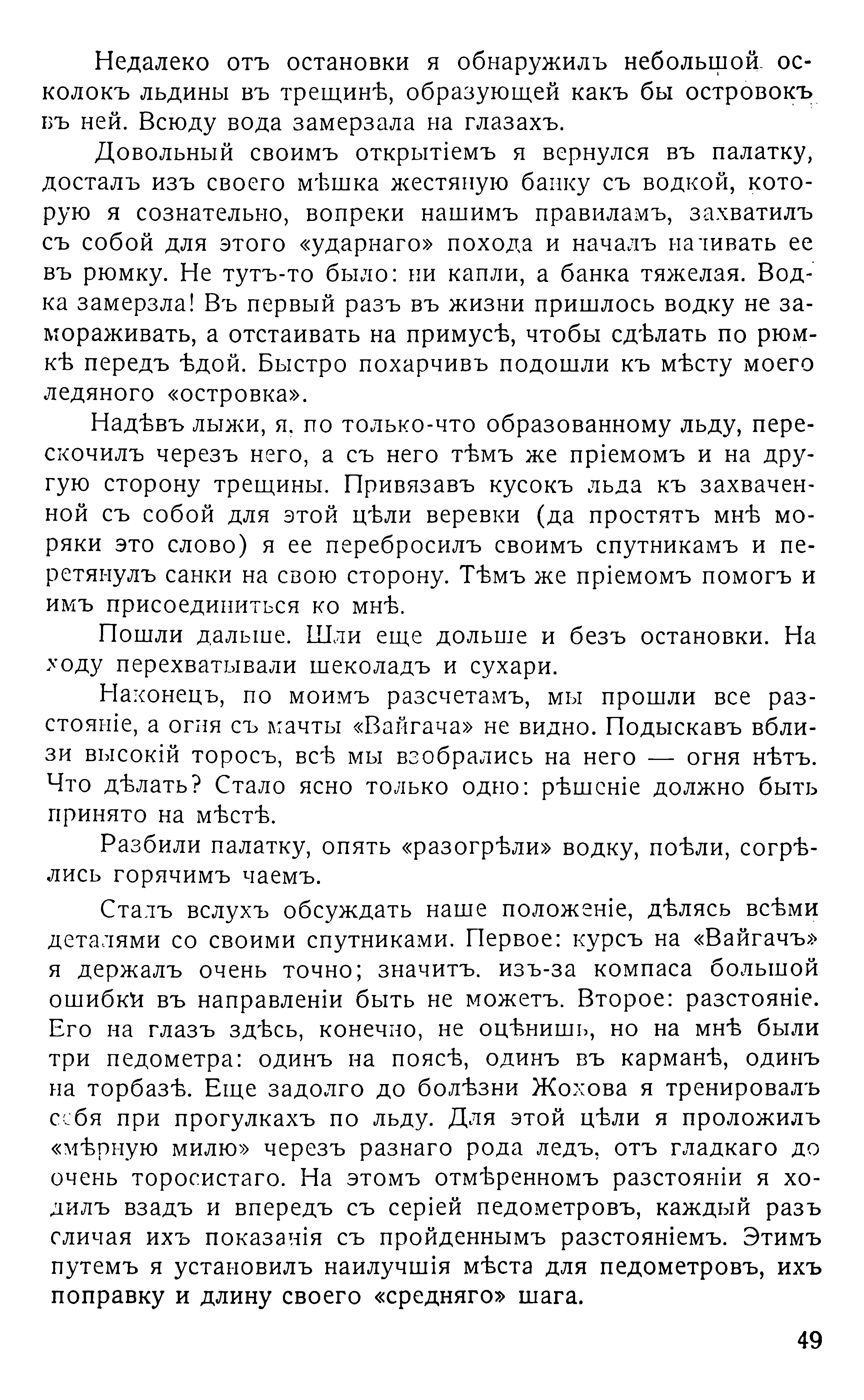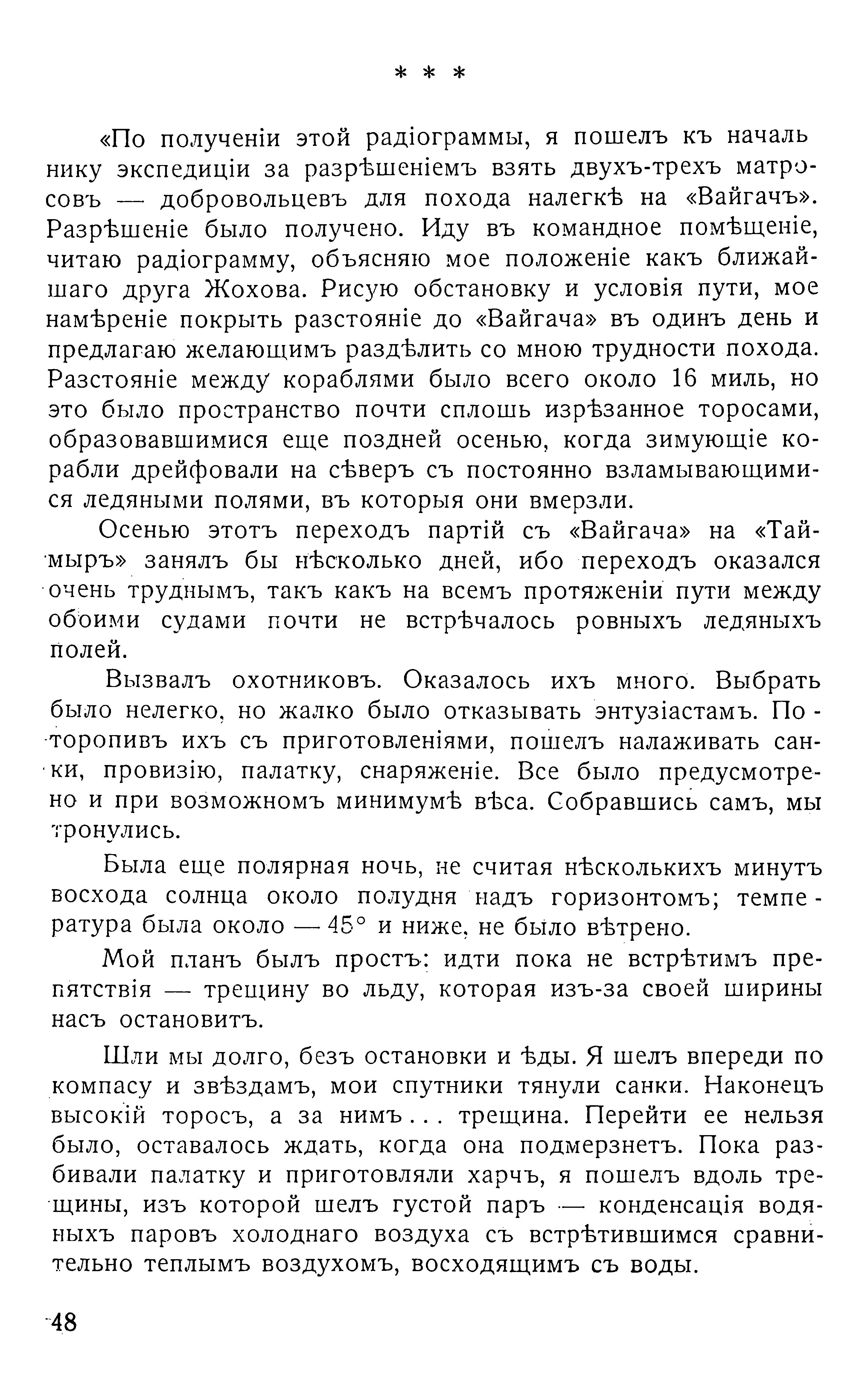 «По полученіи этой радіограммы, я пошелъ къ начальнику экспедиціи за разрѣшеніемъ взять двухъ-трехъ матросовъ — добровольцевъ для похода налегкѣ на «Вайгачъ». Разрѣшеніе было получено. Иду въ командное помѣщеніе, читаю радіограмму, объясняю мое положеніе какъ ближайшаго друга Жохова. Рисую обстановку и условія пути, мое намѣреніе покрыть разстояніе до «Вайгача» въ одинъ день и предлагаю желающимъ раздѣлить со мною трудности похода. Разстояніе между кораблями было всего около 16 миль, но это было пространство почти сплошь изрѣзанное торосами, образовавшимися еще поздней осенью, когда зимующіе корабли дрейфовали на сѣверъ съ постоянно взламывающимися ледяными полями, въ которыя они вмерзли.