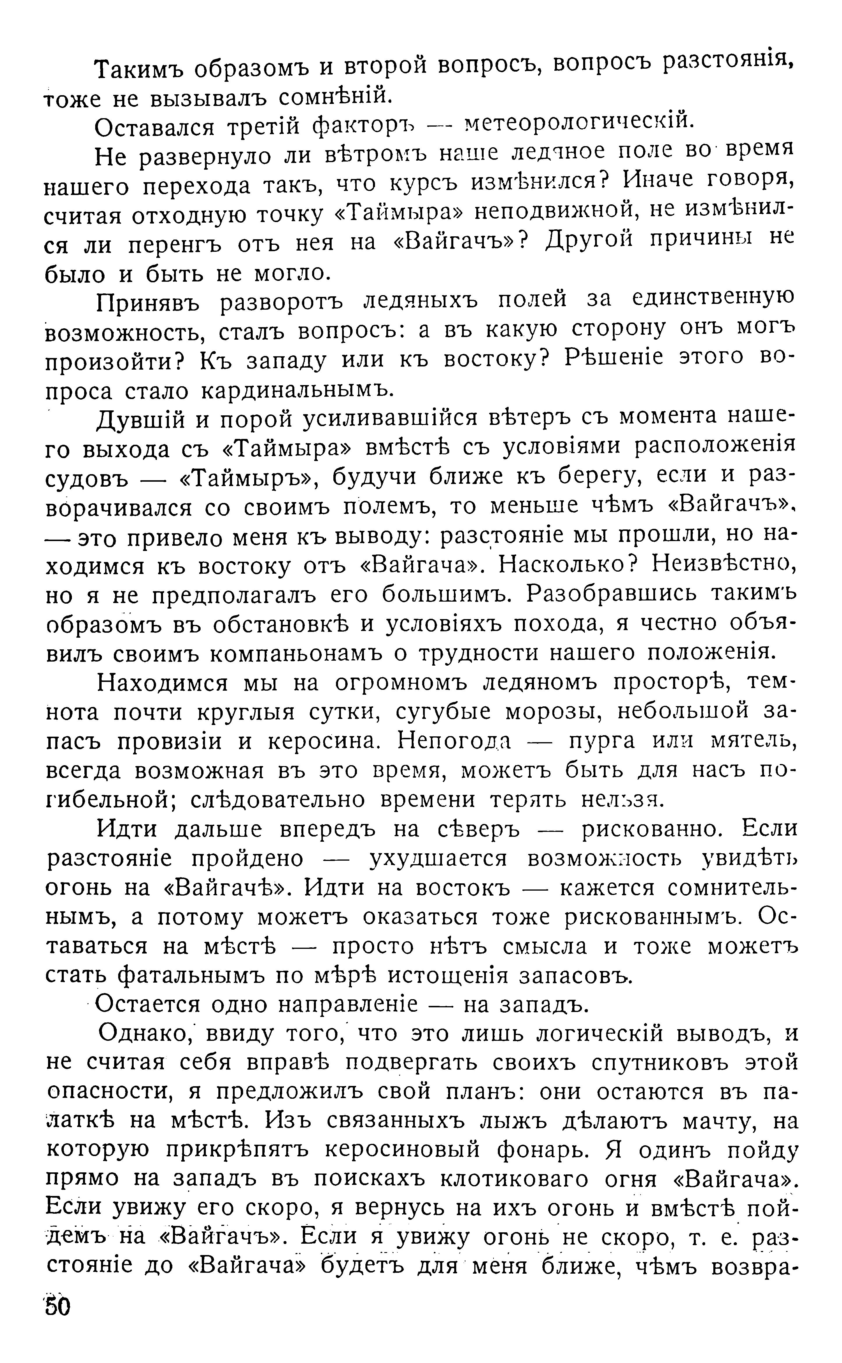 Однако, ввиду того, что это лишь логическій выводъ, и не считая себя вправѣ подвергать своихъ спутниковъ этой опасности, я предложилъ свой планъ: они остаются въ палаткѣ на мѣстѣ. Изъ связанныхъ лыжъ дѣлаютъ мачту, на которую прикрѣпятъ керосиновый фонарь. Я одинъ пойду прямо на западъ въ поискахъ клотиковаго огня «Вайгача». Если увижу его скоро, я вернусь на ихъ огонь и вмѣстѣ пойдемъ на «Вайгачъ». Если я увижу огонь не скоро, т. е. разстояніе до «Вайгача» будетъ для меня ближе, чѣмъ возвра-