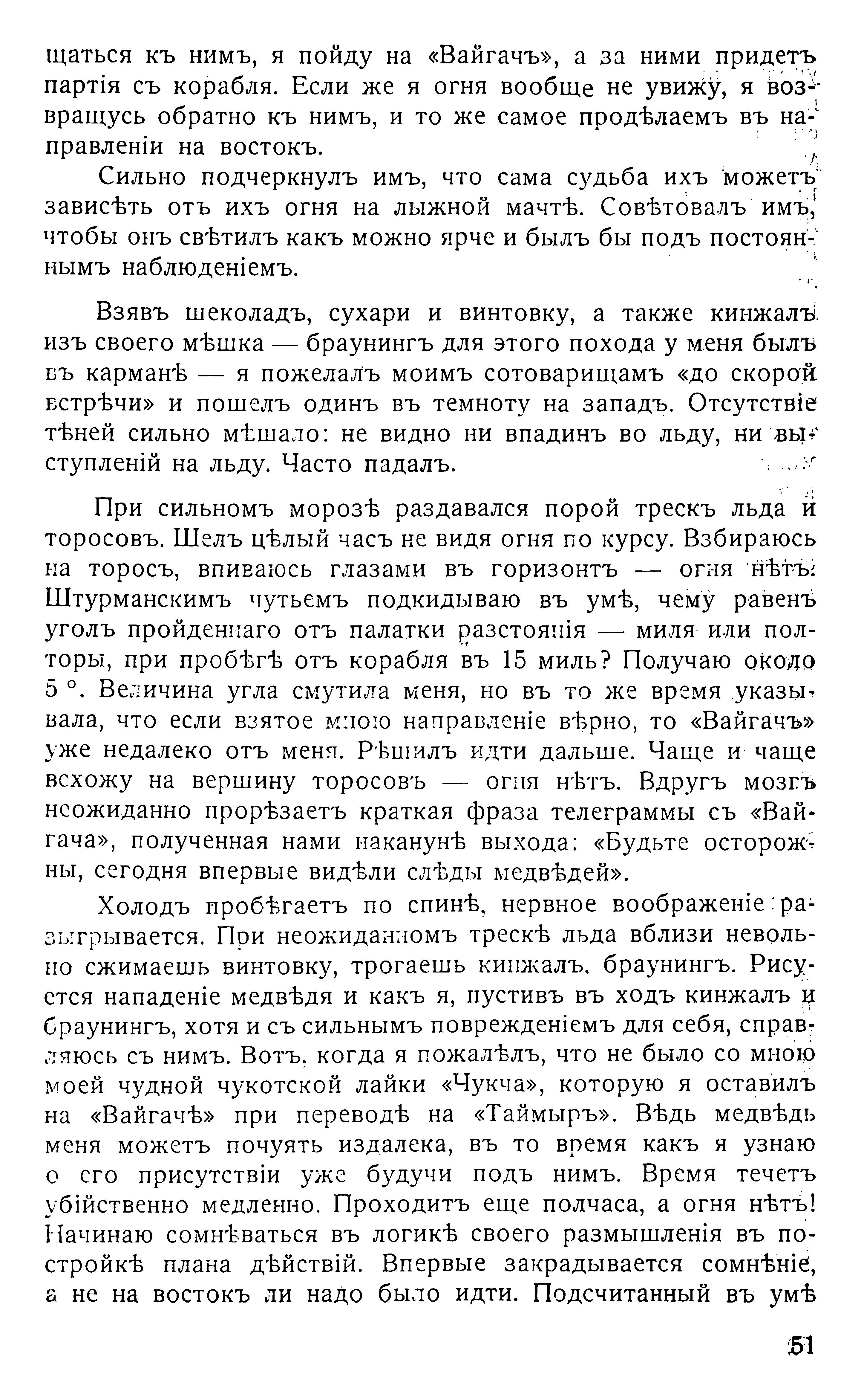 При сильномъ морозѣ раздавался порой трескъ льда и торосовъ. Шелъ цѣлый часъ не видя огня по курсу. Взбираюсь н торосъ, впиваюсь глазами въ горизонтъ — огня нѣтъ. Штурманскимъ чутьемъ подкидываю въ умѣ, чему равенъ уголъ пройденнаго отъ палатки разстоянія — миля или полторы, при пробѣгѣ отъ корабля въ 15 миль? Получаю около 5 °. Величина угла смутила меня, но въ то же время указывала, что если взятое мною направленіе вѣрно, то «Вайгачъ» уже недалеко отъ меня. Рѣшилъ идти дальше. Чаще и чаще всхожу на вершину торосовъ — огня нѣтъ. Вдругъ мозгъ неожиданно прорѣзаетъ краткая фраза телеграммы съ «Вайгача», полученная нами наканунѣ выхода: «Будьте осторожны, сегодня впервые видѣли слѣды медвѣдей».