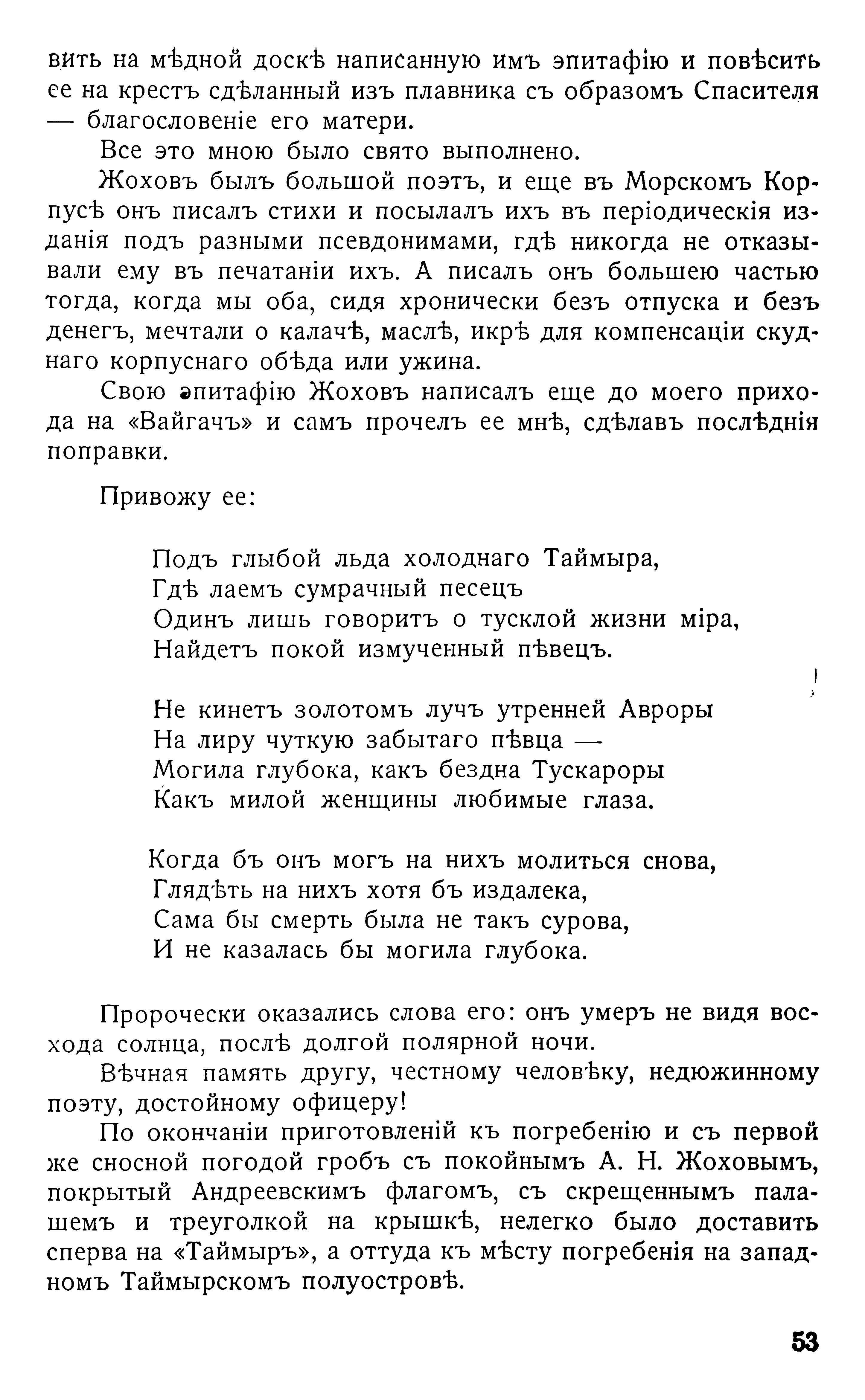 Свою эпитафію Жоховъ написалъ еще до моего прихода на «Вайгачъ» и самъ прочелъ ее мнѣ, сдѣлавъ послѣднія поправки.