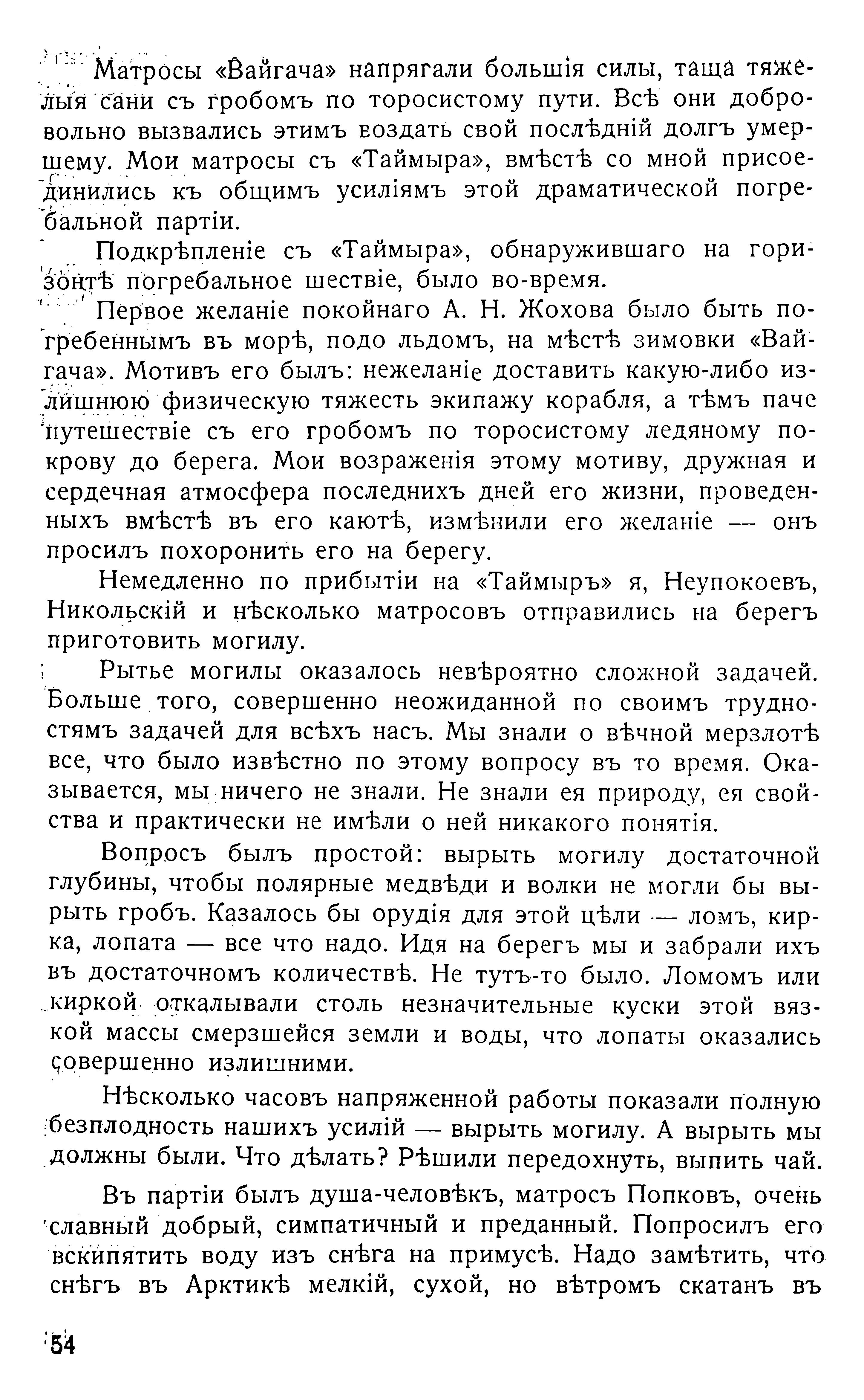 Первое желаніе покойнаго А. Н. Жохова было быть погребеннымъ въ морѣ, подо льдомъ, на мѣстѣ зимовки «Вайгача». Мотивъ его былъ: нежеланіе доставить какую-либо излишнюю физическую тяжесть экипажу корабля, а тѣмъ паче путешествіе съ его гробомъ по торосистому ледяному покрову до берега. Мои возраженія этому мотиву, дружная и сердечная атмосфера последнихъ дней его жизни, проведенныхъ вмѣстѣ въ его каютѣ, измѣнили его желаніе — онъ просилъ похоронить его на берегу.