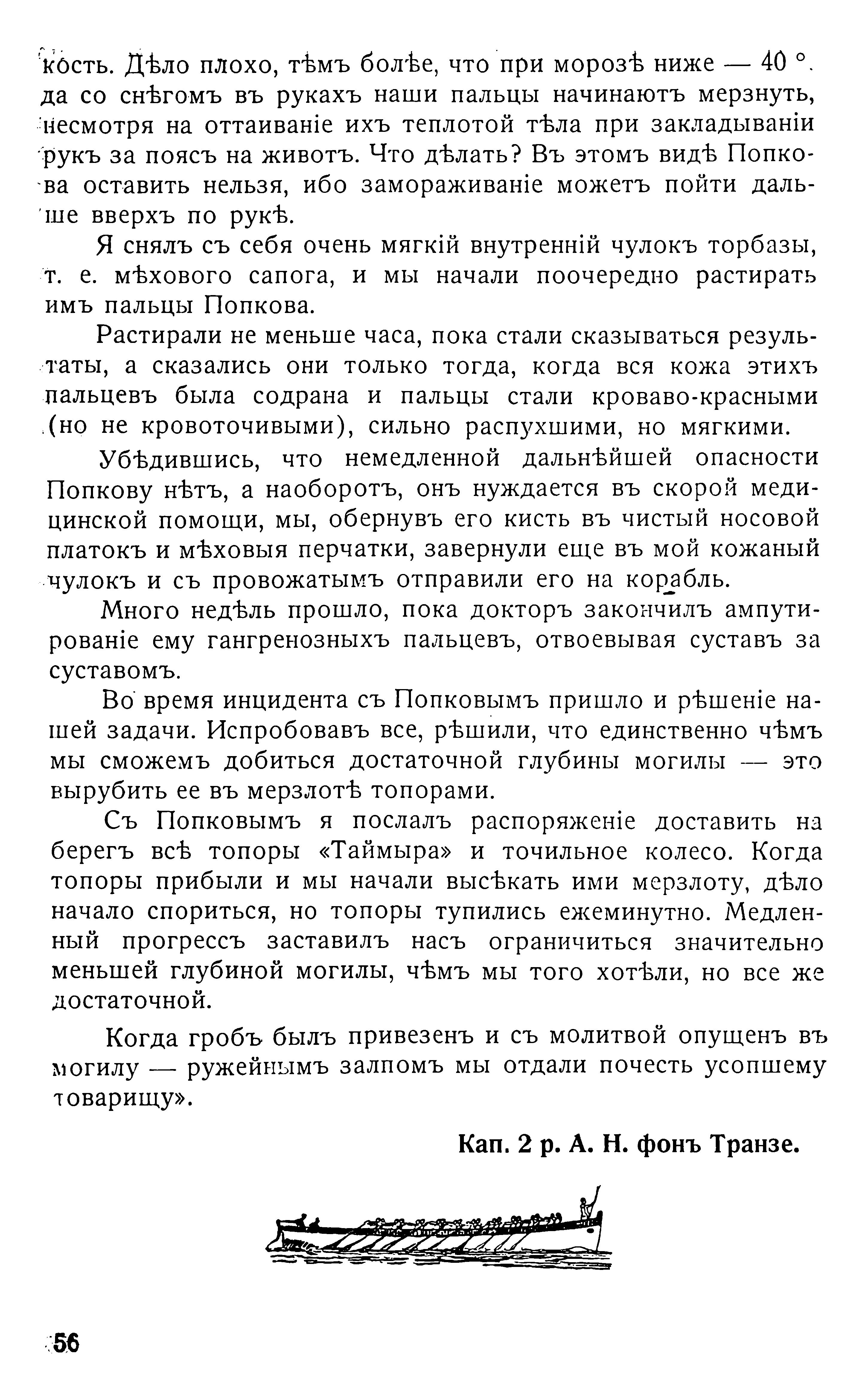 Немедленно по прибытіи на «Таймыръ» я, Неупокоевъ, Никольскій и нѣсколько матросовъ отправились на берегъ приготовить могилу.