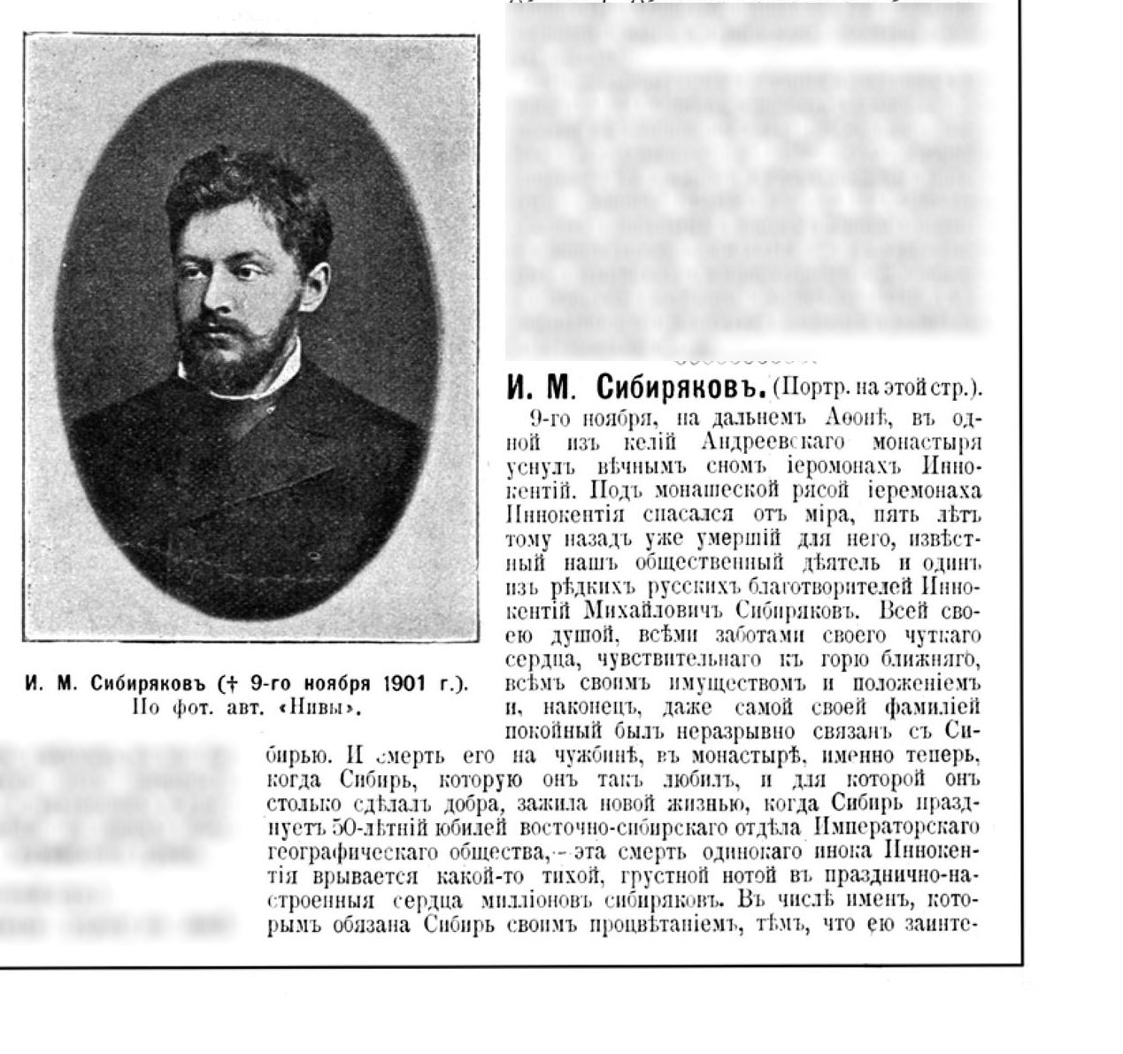 На рубеже XIX-XX веков А.М.Сибиряков отходит от активной предпринимательской деятельности, обращает капиталы в процентные бумаги и облигации, покидает Иркутск, подолгу живет на юге России, в своем Батумском имении Ангара, и за границей. Умер Александр Михайлович Сибиряков в 1933 году в Ницце. В дело культурного развития, изучения и освоения Сибири он вложил более 1,5 миллионов рублей. В 1880 году Александр Михайлович жертвует 200 тысяч рублей на создание Томского университета, для которого приобрел уникальное собрание книг - более 6400 томов из библиотеки В.А.Жуковского. Через шесть лет А.М.Сибиряков передает Иркутску 50 тысяч рублей на учреждение здесь Высшего технического училища. Ранее, в 1876 году, он подарил Иркутской мужской гимназии скульптуру Ивана Грозного работы М.М.Антокольского и три полотна И.К.Айвазовского, до сих пор составляющие гордость Иркутского художественного музея. В 1882 году в сибиряковском доме открывается бесплатная народная школа на 80 учащихся, в 1884-м - Троицкое отделение школы. Всего же на устройство народных школ Александром Михайловичем пожертвовано 800 тысяч рублей. Значительные суммы перечислялись в фонд Общества вспомоществования учащимся Восточной Сибири и сибирякам, учащимся в Санкт-Петербурге. Проценты с капитала в 50 тысяч рублей шли на выплаты премий за лучшее научное исследование о Сибири. В 1899 году, например, такой премии был удостоен историк Н.Н.Оглоблин за капитальный труд "Обозрение столбцов и книг Сибирского приказа (1592- 1768)"{8}. В 1886 году А.М.Сибиряков жертвует 12 тысяч рублей типографии газеты "Сибирь". Семь лет (1885-1892) на средства Александра Михайловича возводилась церковь во имя Казанской иконы Божией Матери в Ремесленной слободе Иркутска, два года (1896- 1898) - жилые здания для вдов и сирот лиц духовного звания (Тихоновская богадельня)9. 10 тысяч рублей серебром - таков вклад А.М.Сибирякова в строительство церкви на Валааме.