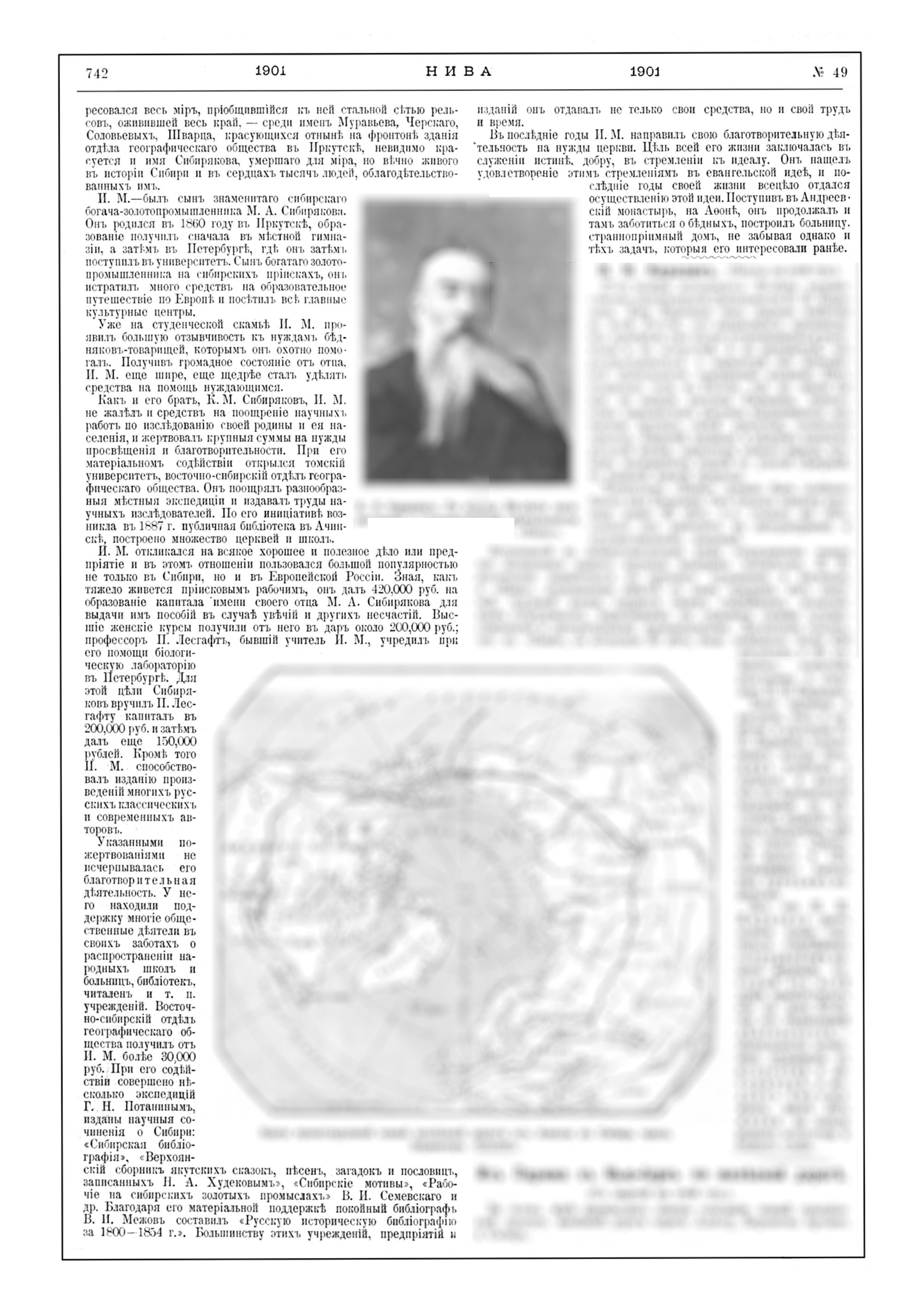 Постепенно фамильный капитал Сибиряковых растет, достигнув к середине XIX века огромных размеров. Именно тогда меценатство и благотворительность становятся неотъемлемой частью их жизни. В этом смысле наиболее заметны фигуры Михаила Александровича Сибирякова (1815- 1874), крупного золотопромышленника, и его детей - Александра, Константина, Иннокентия и Анны.