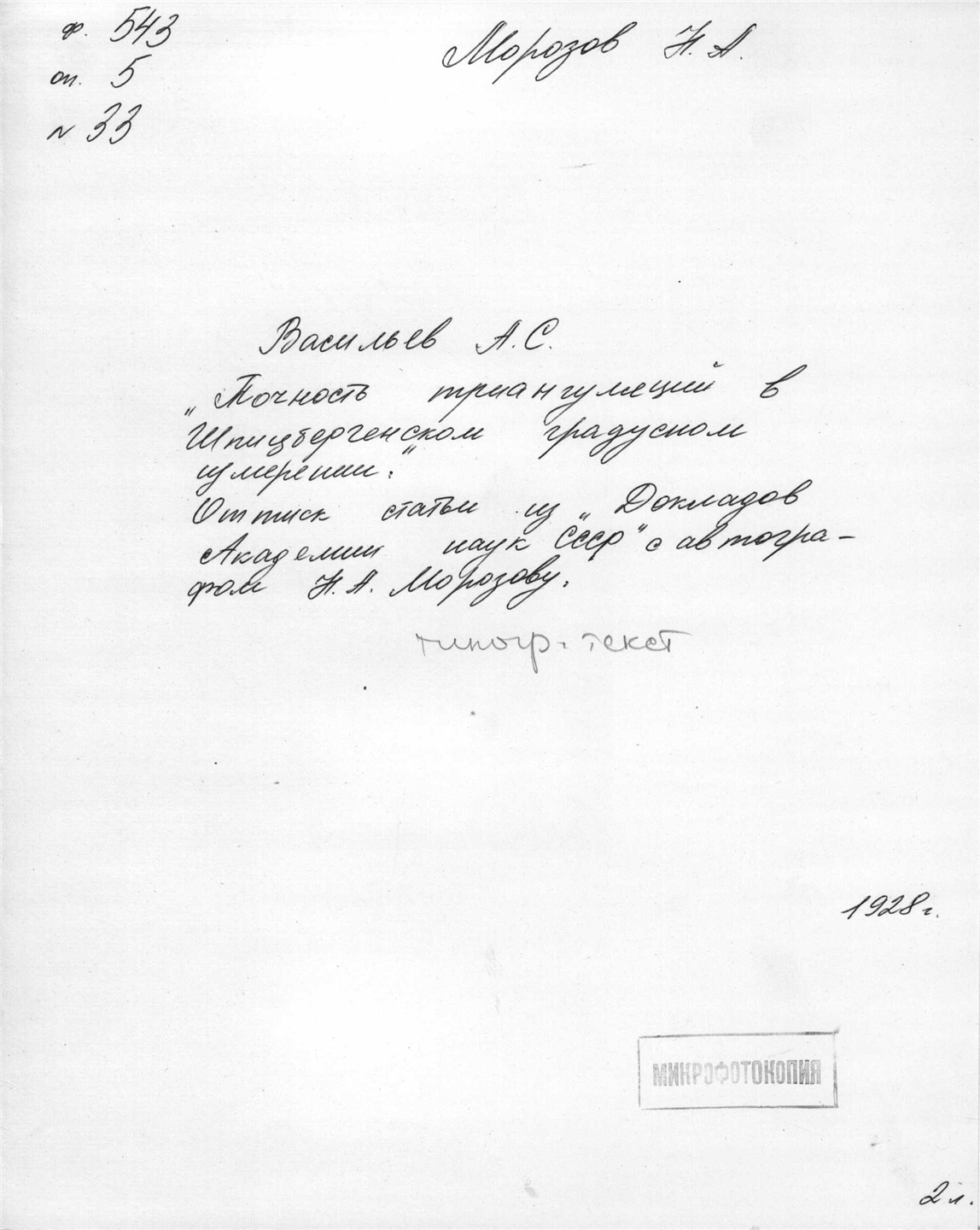 Соч.: Влияние формы и приливов земной атмосферы на зенитные расстояния светил, "Известия Российской акад. наук", 1919, т. 13, ч. 1, № 3; Нереальная оценка точности нивелирований горизонтальной оси в пассажных инструментах, ч. 1—3, "Известия Акад. наук СССР. Отд. физ.-мат. наук", 1928, № 2, стр. 151—72; № 3. стр. 215—40; № 4—5, стр. 303—318;