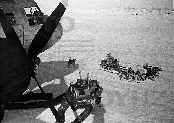 Фотокорреспонденты «Огонька» и Фотохроники и даже второй пилот нашего самолета Константин Фомич Михайленко ринулись на деда, разом нацелившись на него чуть ли не дюжиной объективов «Леек», «Фэдов», "Контаксов» и «Лингофов». Собаки, ошалев от такой встречи, волчком крутились на месте, путались в постромках, грызлись. Вожак упряжки Буян глухо тявкал и, должно, никак не мог сообразить, что ему делать: то ли защищать своего хозяина, то ли бежать вон. Наконец он все же завилял хвостом-баранкой. и грациозно уселся рядом с нартами.