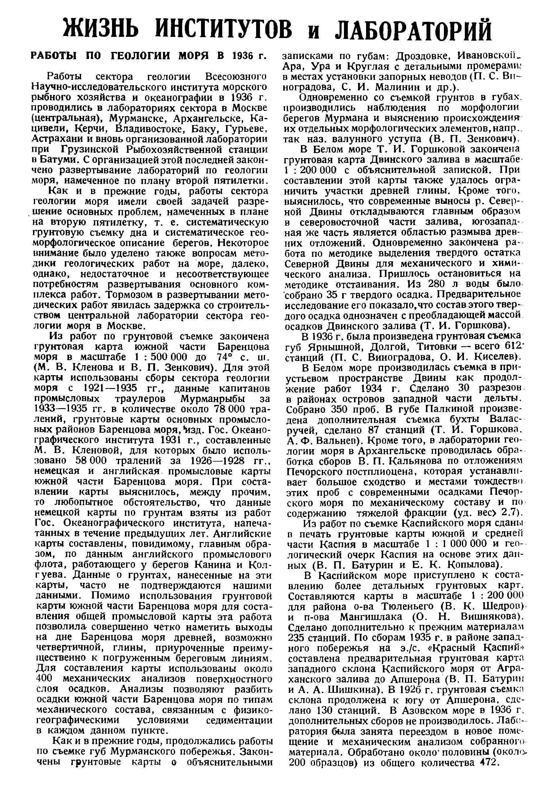 РАБОТЫ ПО ГЕОЛОГИИ МОРЯ В 1936 г.Работы сектора геологии Всесоюзного Научно-исследовательского института морского рыбного хозяйства и океанографии в 1936 г. проводились в лабораториях сектора в Москве (центральная), Мурманске, Архангельске, Кацивели, Керчи, Владивостоке, Баку, Гурьеве, Астрахани и вновь организованной лаборатории при Грузинской Рыбохозяйственной станции в Батуми. С организацией этой последней закончено развертывание лабораторий по геологии моря, намеченное по плану второй пятилетки.