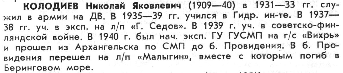 КОЛОДИЕВ Николай Яковлевич (1909—40) в 1931—33 гг. служил в армии на ДВ. В 1935—39 гг. учился в Гидр, ин-те. В 1937— 38 гг. уч. в эксп. на л/п «Г. Седов». В 1939 г. уч. в советско-финляндской войне. В 1940 г. был нач. эксп. ГУ ГУСМП на г/с «Вихрь» и прошел из Архангельска по СМП до б. Провидения. В б. Провидения перешел на л/п «Малыгин», вместе с которым погиб в Беринговом море.
