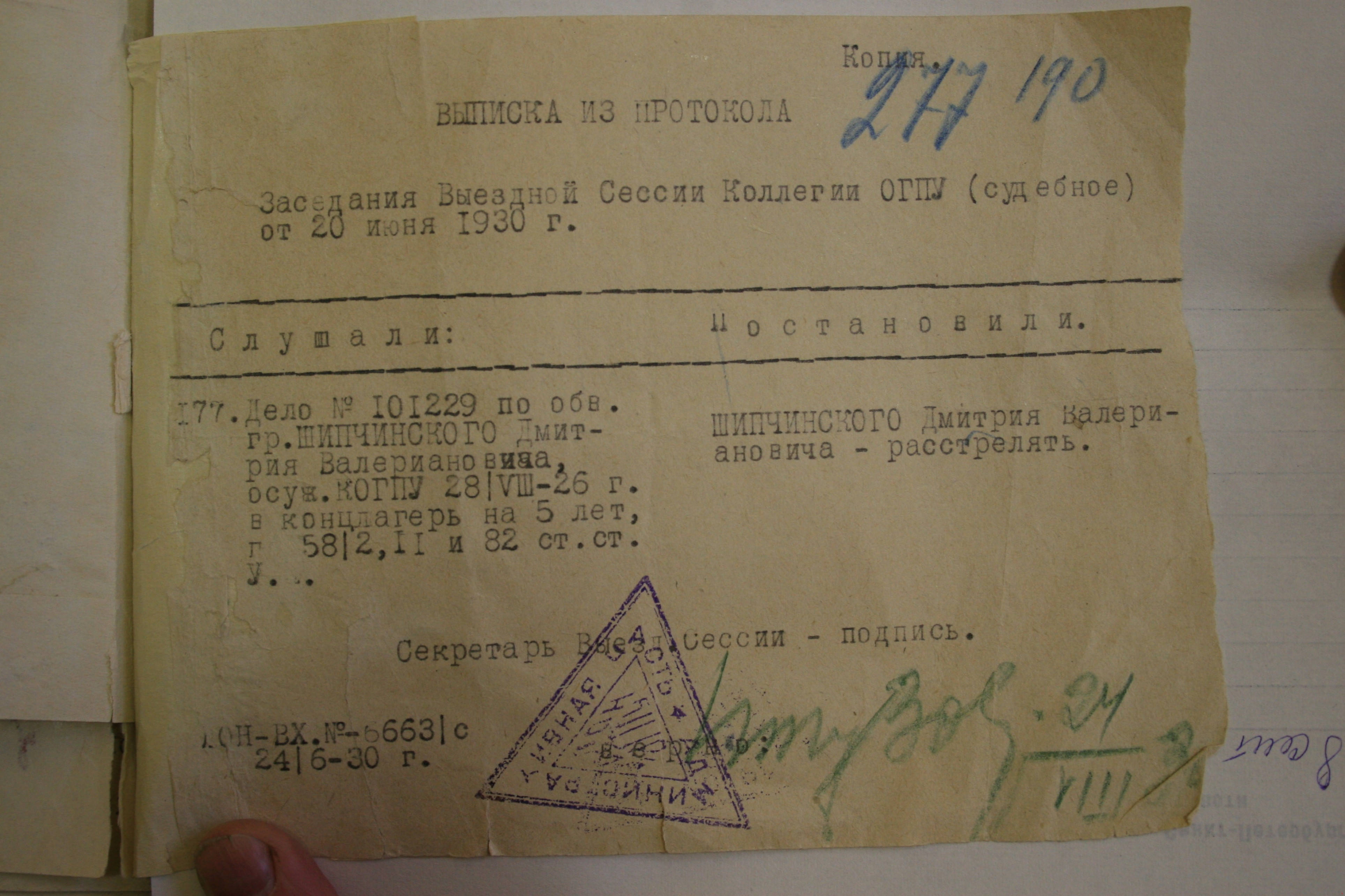 1930-06-21 Приговорен к расстрелу Выездной сессией Коллегии ОГПУ по ст. 58-2 (вооружённое восстание), 82 ч.1 (побег)УК