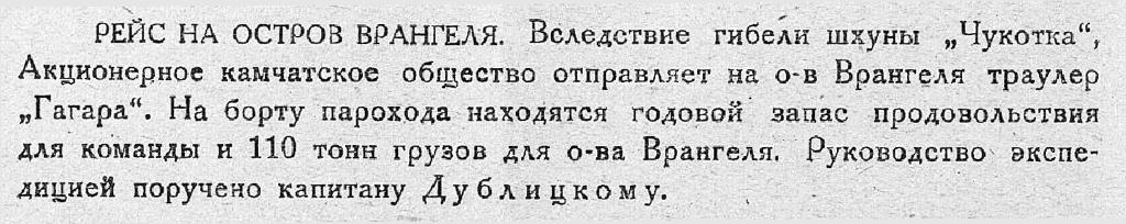 В 1926 году пароход «Ставрополь» под командованием П. Г. Миловзорова (см.) доставил на о. Врангеля первых советских поселенцев во главе с Г. А. Ушаковым (см.). Это позволило пресечь притязания на остров канадцев и американцев. Два последующих года судно из-за тяжелой ледовой обстановки не могло пробиться к зимовщикам. Положение становилось критическим, тем более, что в поселении не было радиостанции.