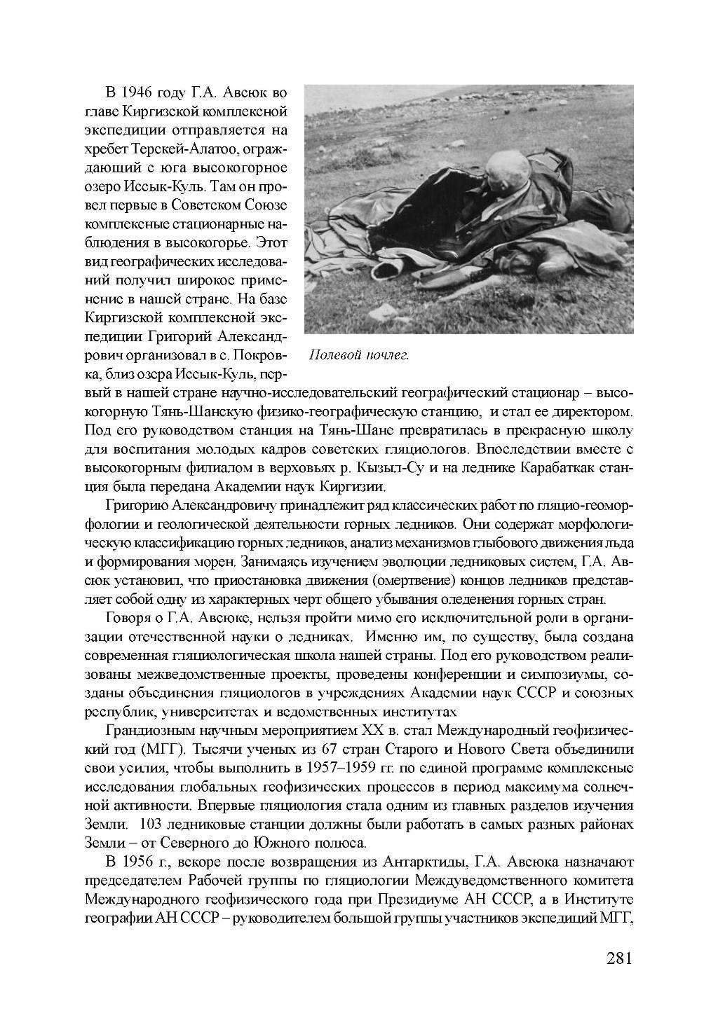 В 1956 г., вскоре после возвращения из Антарктиды, ГА. Авсюка назначают председателем Рабочей группы по гляциологии Междуведомственного комитета Международного геофизического года при Президиуме АН СССР, а в Институте географии АН СССР - руководителем большой группы участников экспедиций МГГ,