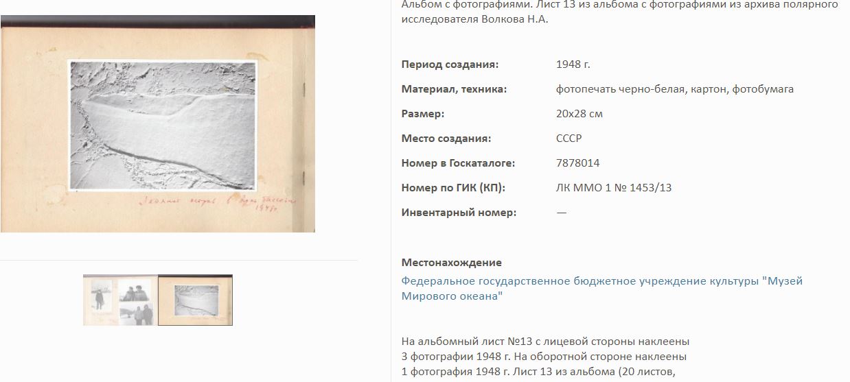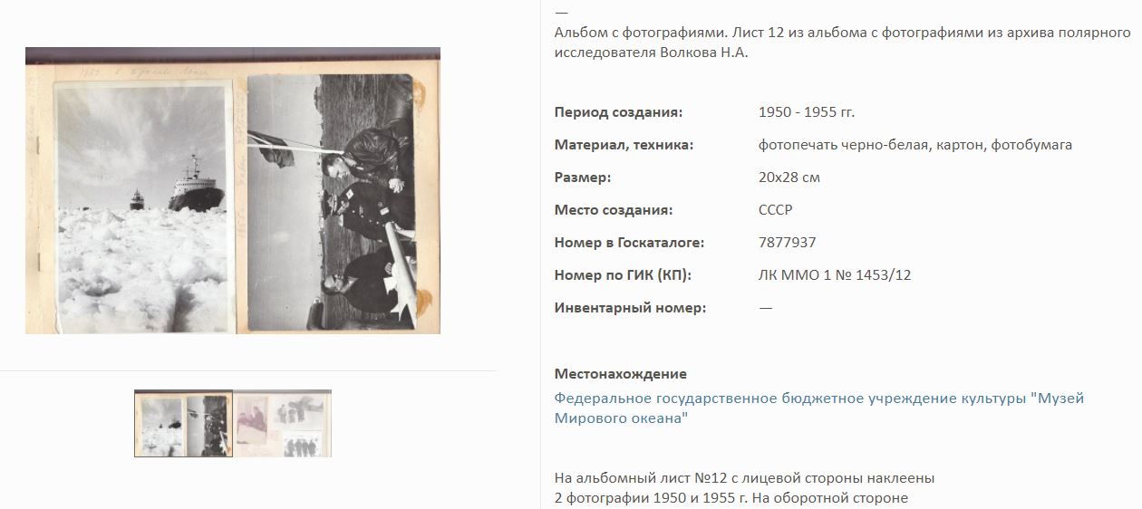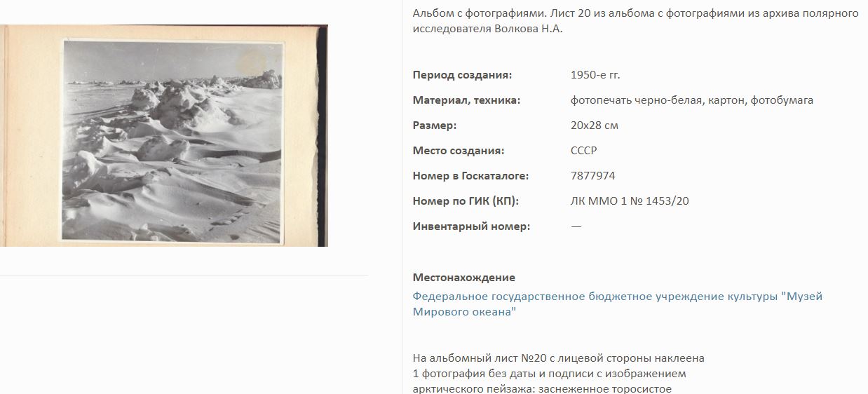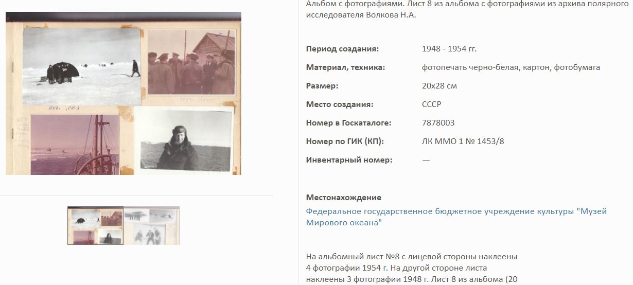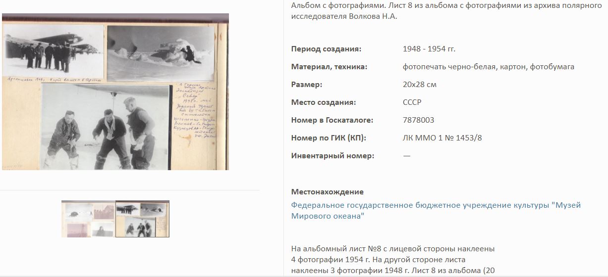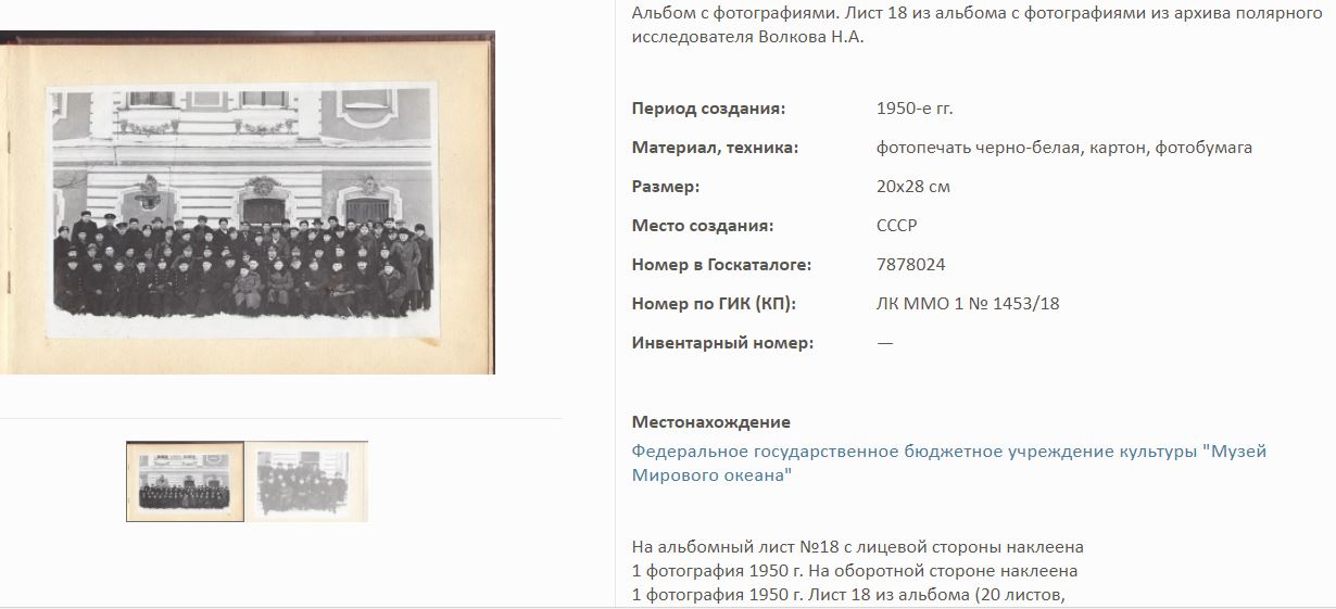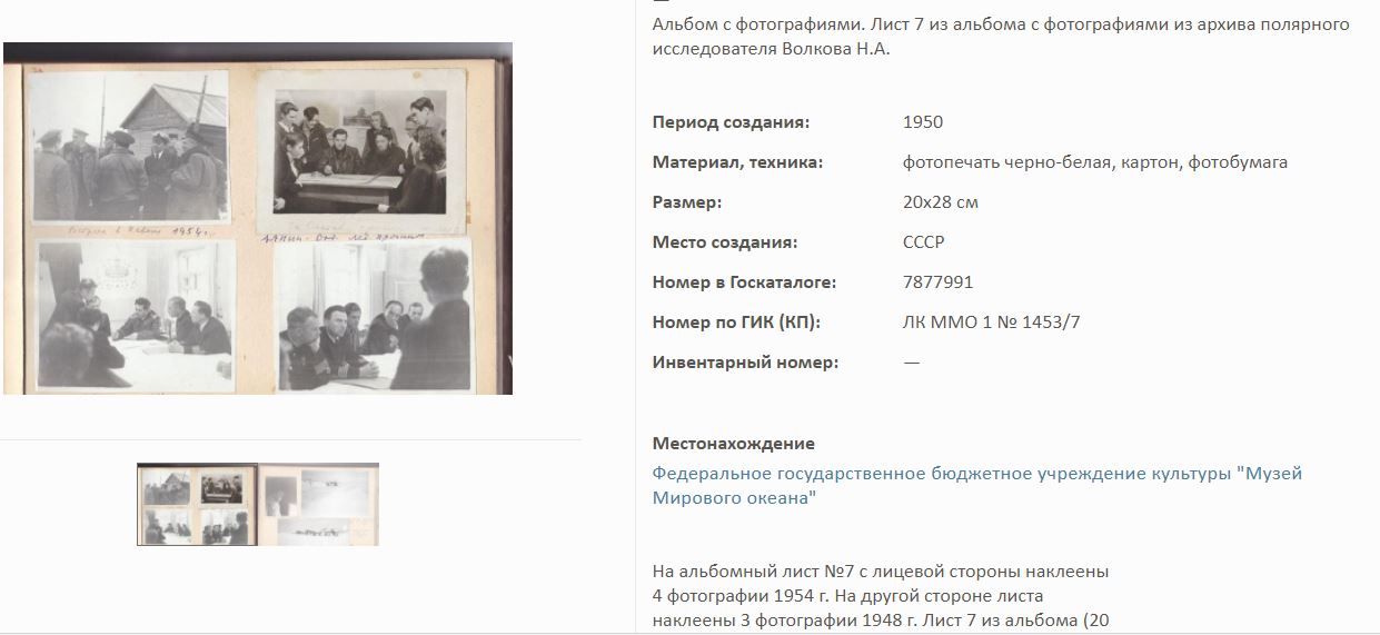 На сайте Госкаталог.РФ выложены экспонаты Калининградского Музея мирового океана. Среди них фотоальбом Волкова Н.А. по полярным исследованиям.