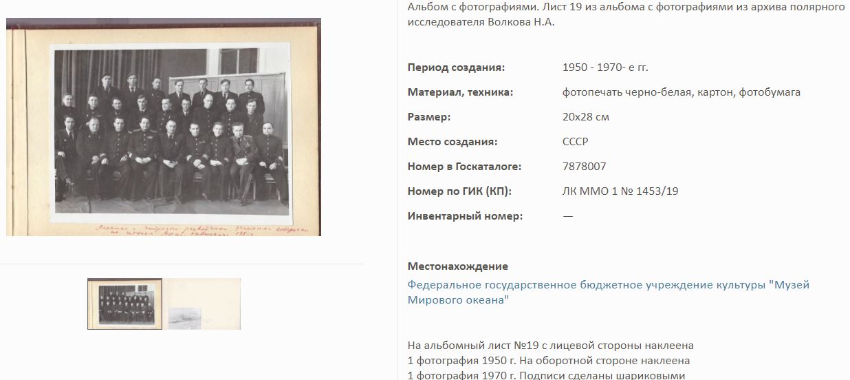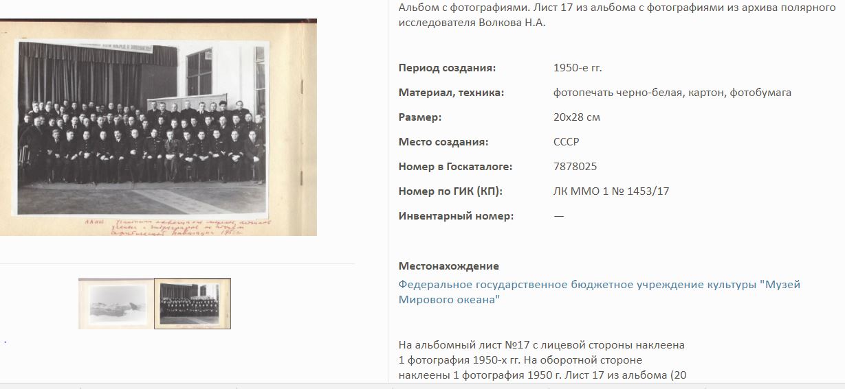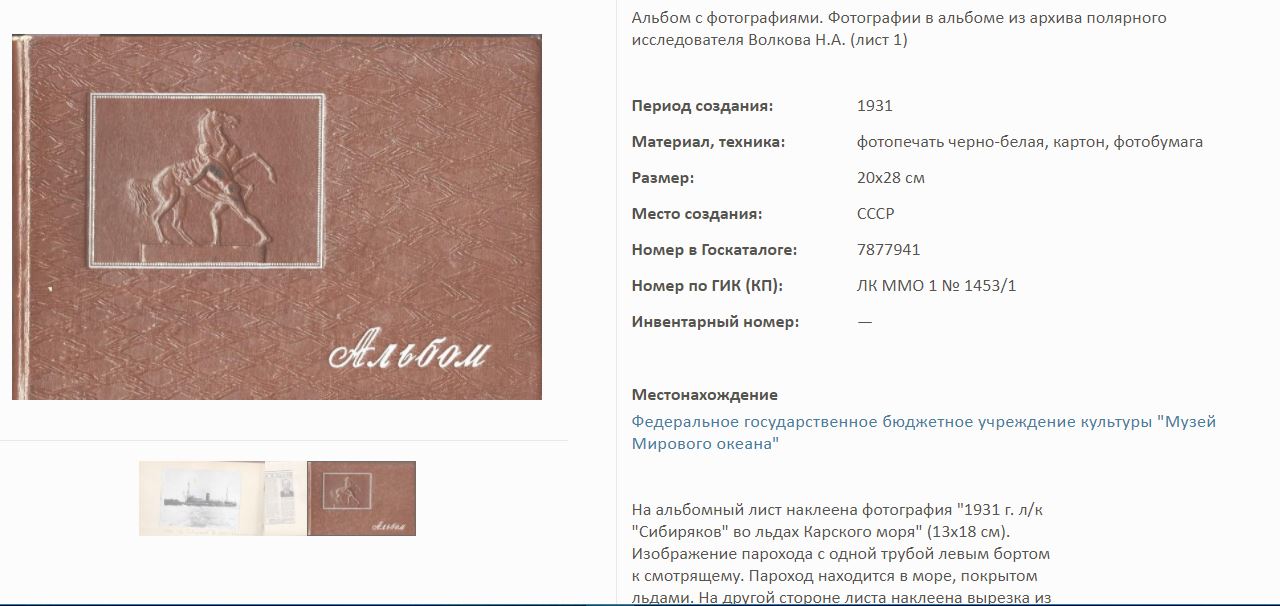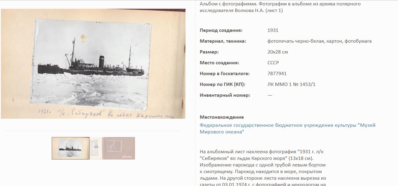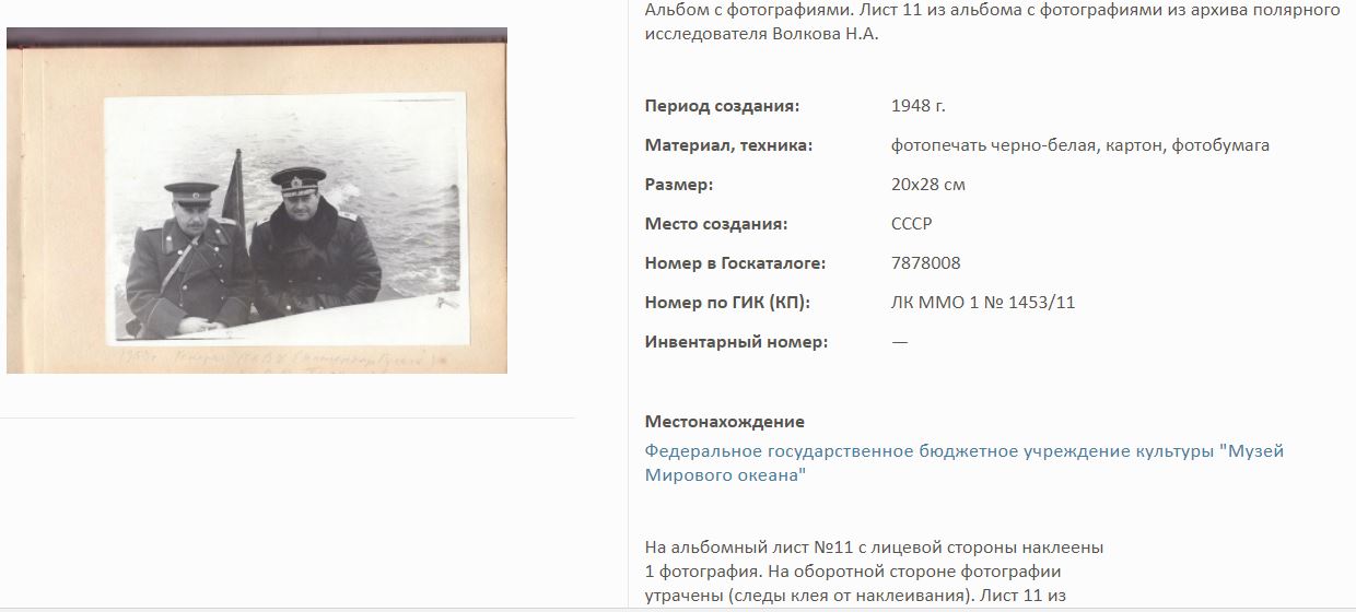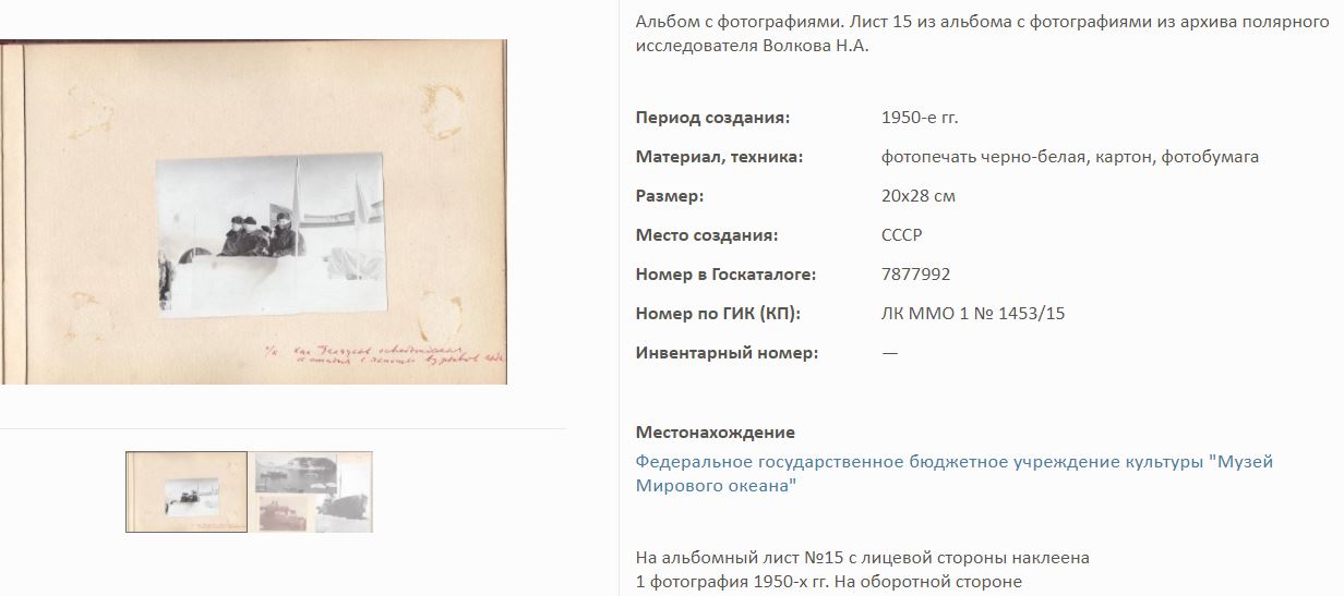На сайте Госкаталог.РФ выложены экспонаты Калининградского Музея мирового океана. Среди них фотоальбом Волкова Н.А. по полярным исследованиям.