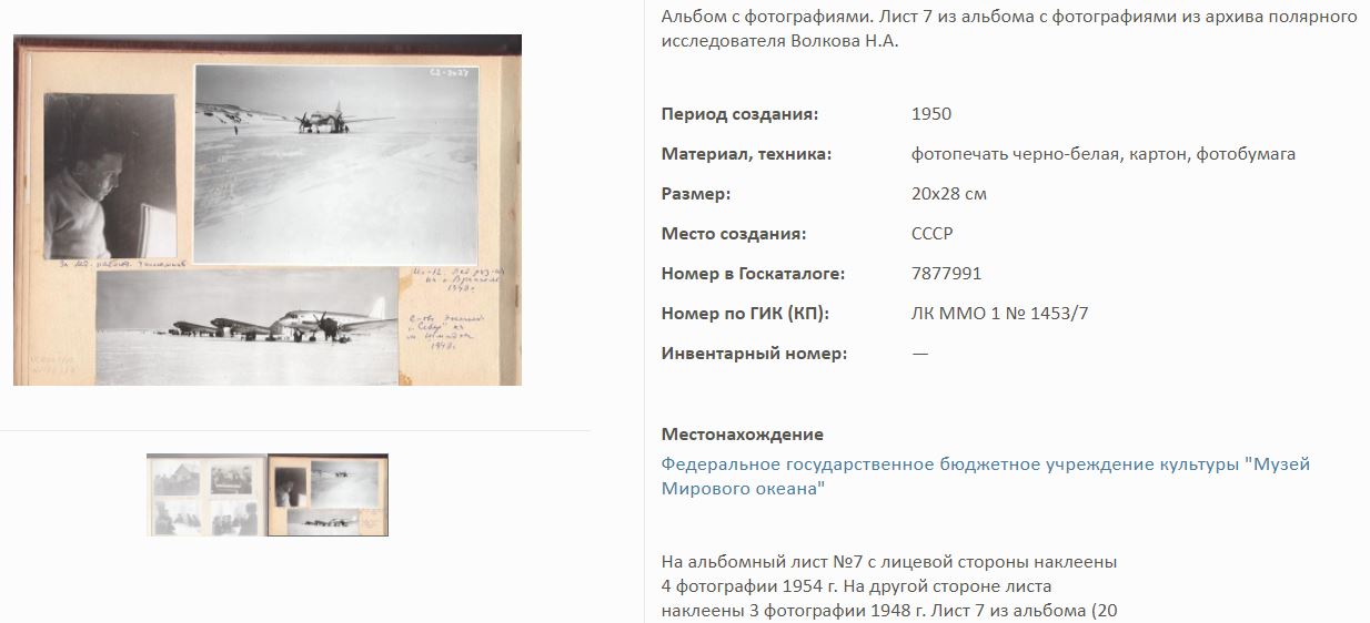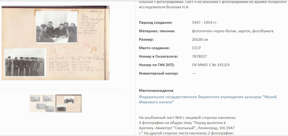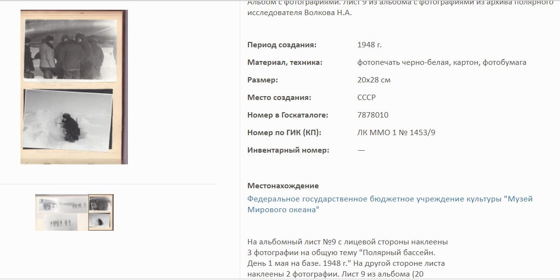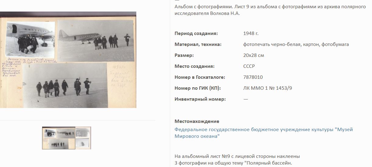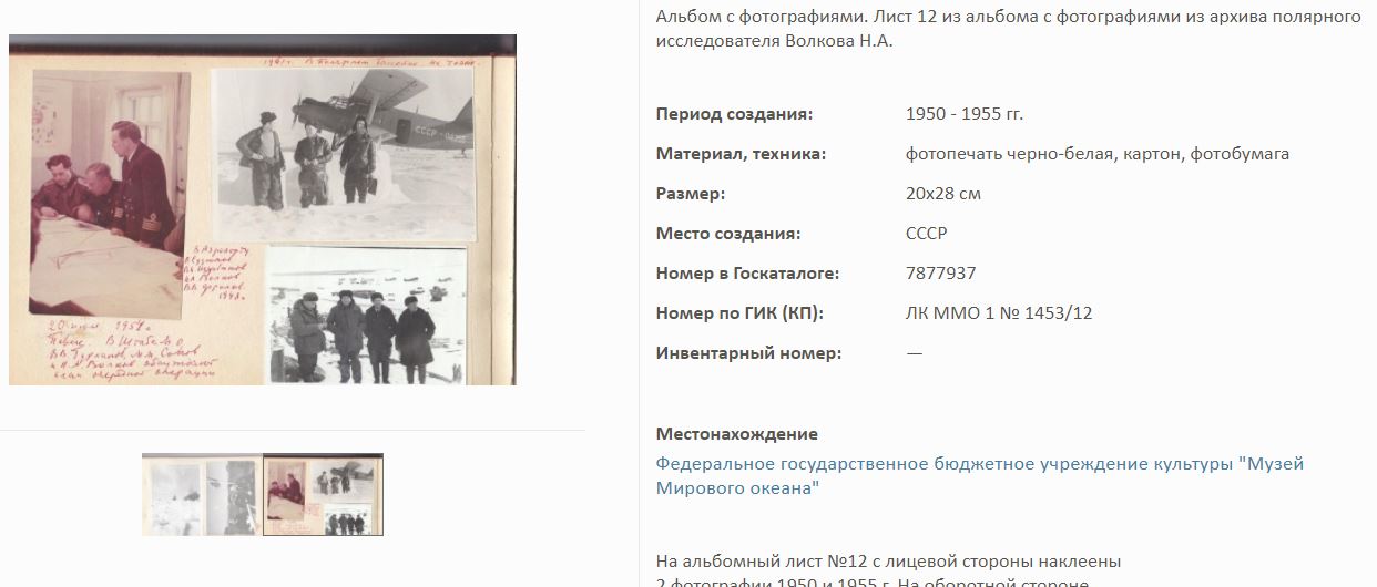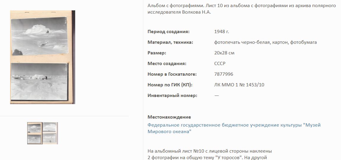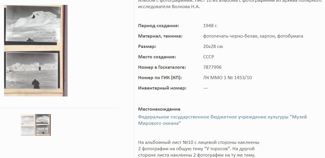 На сайте Госкаталог.РФ выложены экспонаты Калининградского Музея мирового океана. Среди них фотоальбом Волкова Н.А. по полярным исследованиям.
