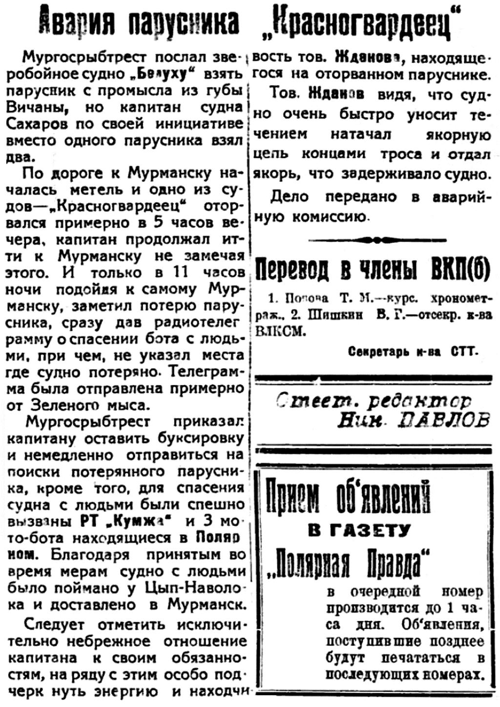 Полярная Правда, 1932, №010, 11 января Авария КРАСНОГВАРДЕЕЦ.jpg