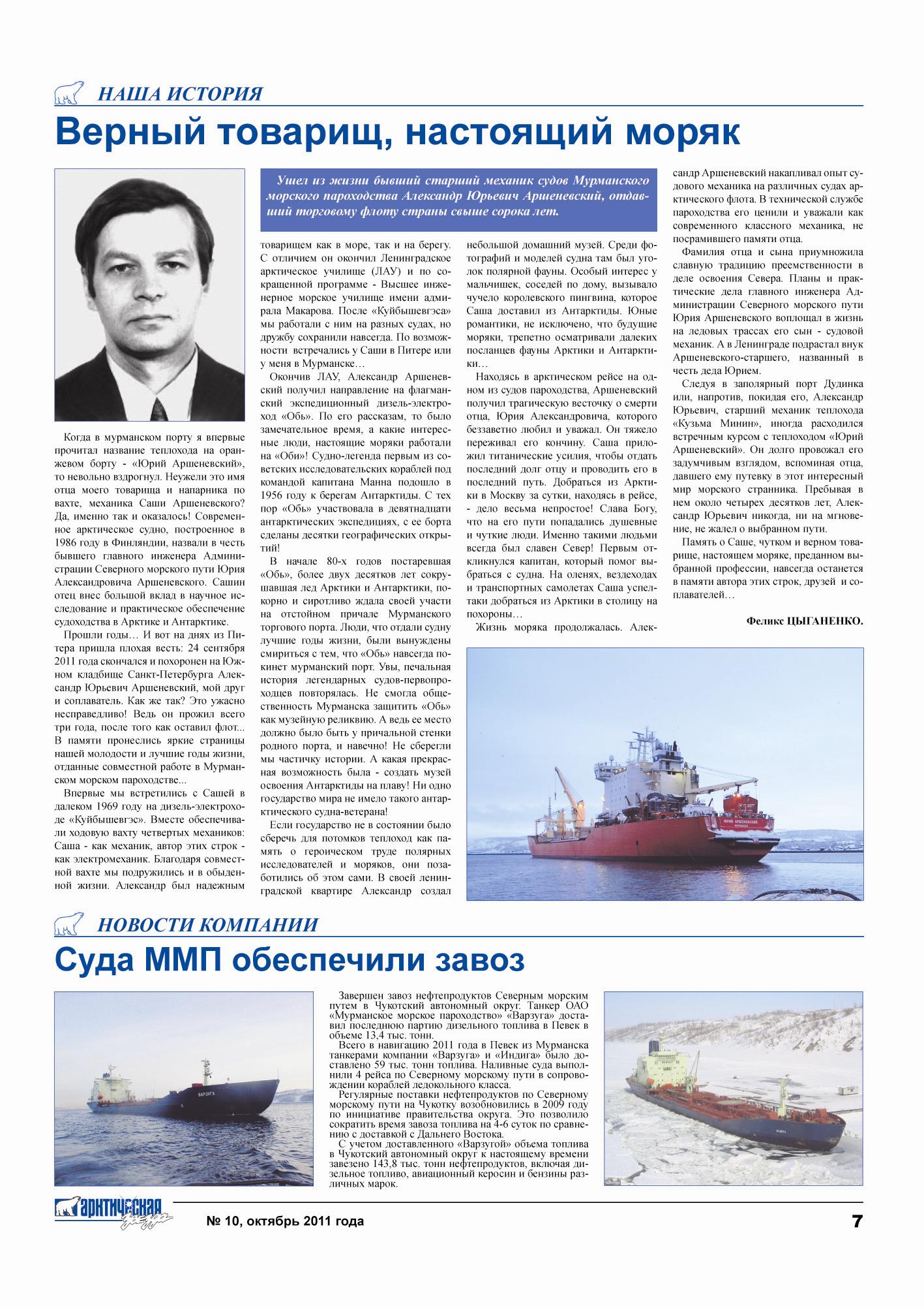 Верный товарищ, настоящий морякУшел из жизни бывший старший механик судов Мурманского морского пароходства Александр Юрьевич Аршеневский, отдавший торговому флоту страны свыше сорока лет.Феликс Цыганенко.Когда в мурманском порту я впервые прочитал название теплохода на оранжевом борту - «Юрий Аршеневский», то невольно вздрогнул. Неужели это имя отца моего товарища и напарника по вахте, механика Саши Аршеневского? Да. именно так и оказалось! Современное арктическое судно, построенное в 1986 году в Финляндии, назвали в честь бывшего главного инженера Администрации Северного морского пути Юрия Александровича Аршеневского. Сашин отец внес большой вклад в научное исследование и практическое обеспечение судоходства в Арктике и Антарктике.
