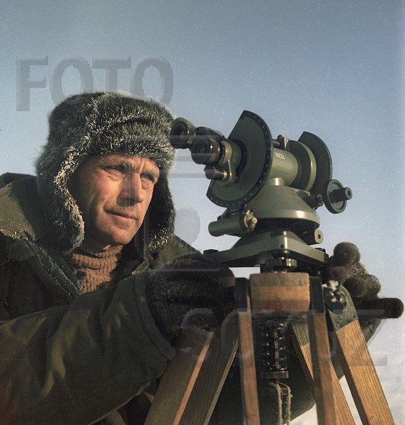 Научно-исследовательская дрейфующая полярная станция "Северный полюс-3" (СП-3). Аэролог Василий Канаки наблюдает за полетом радиозонда. Апрель 1954