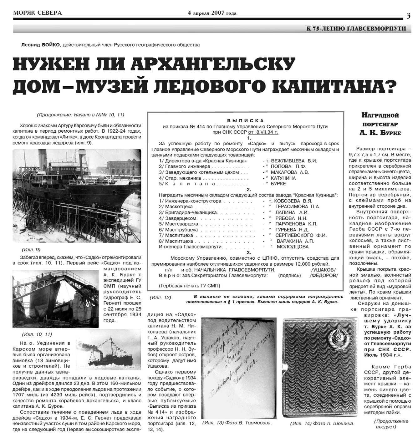 Моряк Севера. 21 марта 2007 (№10), 28 марта 2007 ("11), 4 апреля 2007 (№12), 11 апреля 2007 (№13).