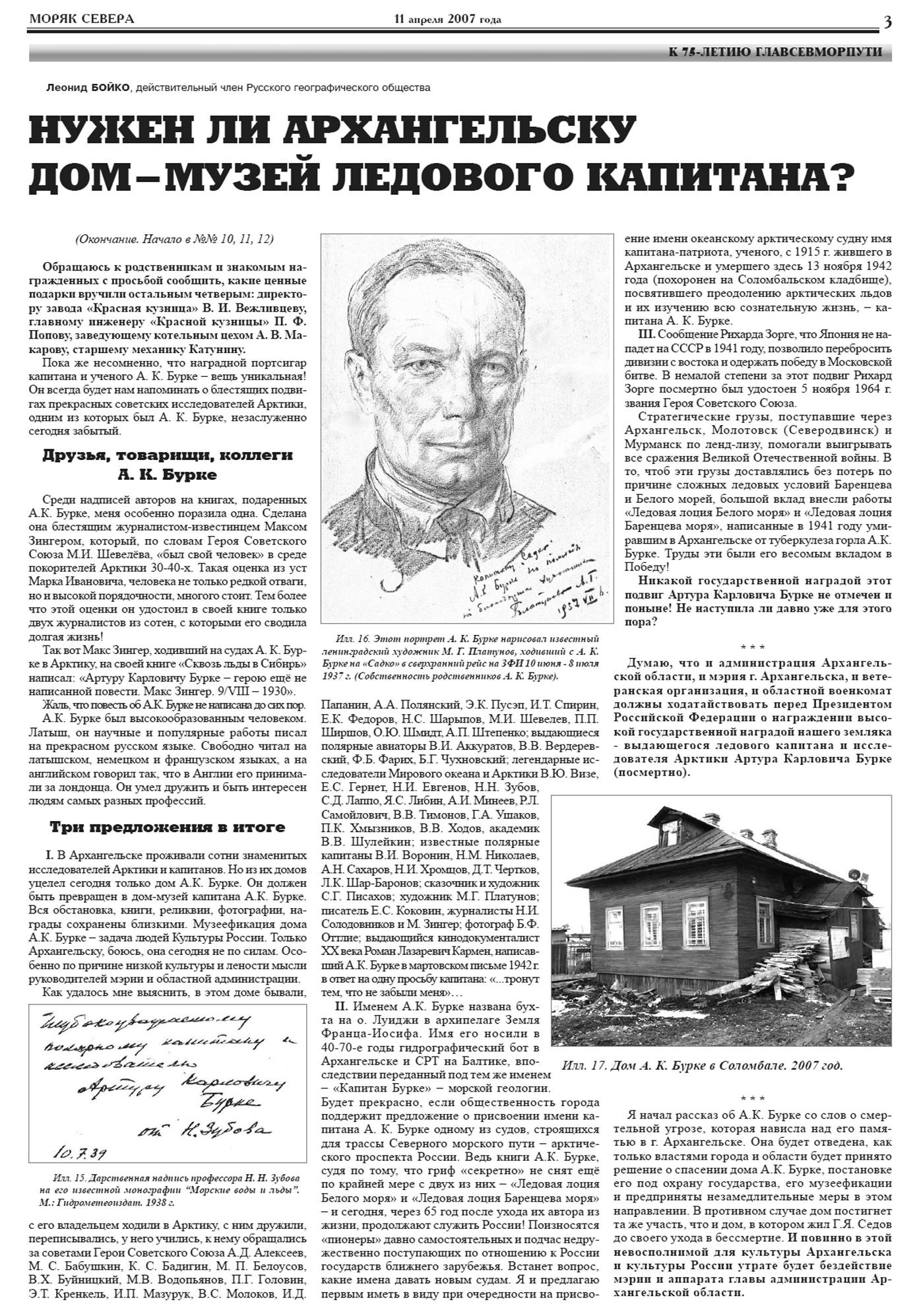 Подсчитано, что среднестатистический советский солдат воевал 11 дней. На 12-й день он был или ранен, или убит. А погибший солдат не наносит урон врагу. Умерший же 13 ноября 1942 года Артур Карлович Бурке продолжал сражаться за Победу и своими трудами, написанными в 1941–1942 годах, и теми, что были им созданы раньше. Труды же эти, о крупном вкладе которых в борьбу с врагом нам поведали профессора Зубов и Шулейкин и доцент Тимонов, до сих пор не принесли их создателю ни ордена, ни даже медали «За победу над Германией в Великой Отечественной войне 1941–1945 гг.». Думаю, подвиги Артура Карловича Бурке – полярного капитана, исследователя, ученого, патриота – заслуживают и увековечения в городе Архангельске мемориальной доской на улице Челюскинцев, где он жил и умер, и присвоения имени Бурке, например, той части улицы Челюскинцев, которая расположена между набережной имени Георгия Седова и Никольским проспектом. После войны в Архангельске имя Бурке носил гидрографический бот, а затем и построенный в 1955 году в ГДР средний рыболовный траулер, позднее переданный морской геологии (порт приписки – Калининград). Общероссийское же значение его подвигов достойно того, чтобы одному из крупных строящихся транспортных или ледокольных судов для Арктики было дано имя выдающегося безаварийного ледового капитана и исследователя Артура Бурке, с пяти трудов которого и до сих пор не снят гриф «секретно». А это значит, что труды эти не стали только фактом истории науки, а продолжают приносить России пользу и сегодня!