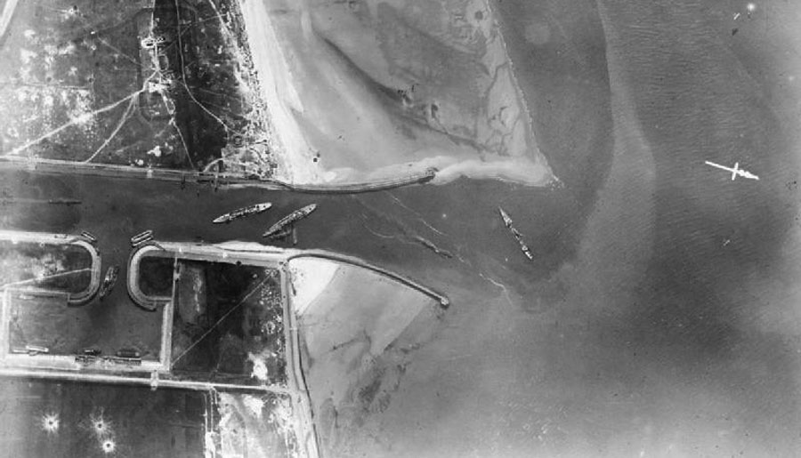 Аэрофотоснимок с затопленным англичанами немецким бронепалубным крейсером «Тетис» (третий слева) в устье канала бельгийского порта Зеебрюгге - базы германских миноносцев и подводных лодок. 1918 г.