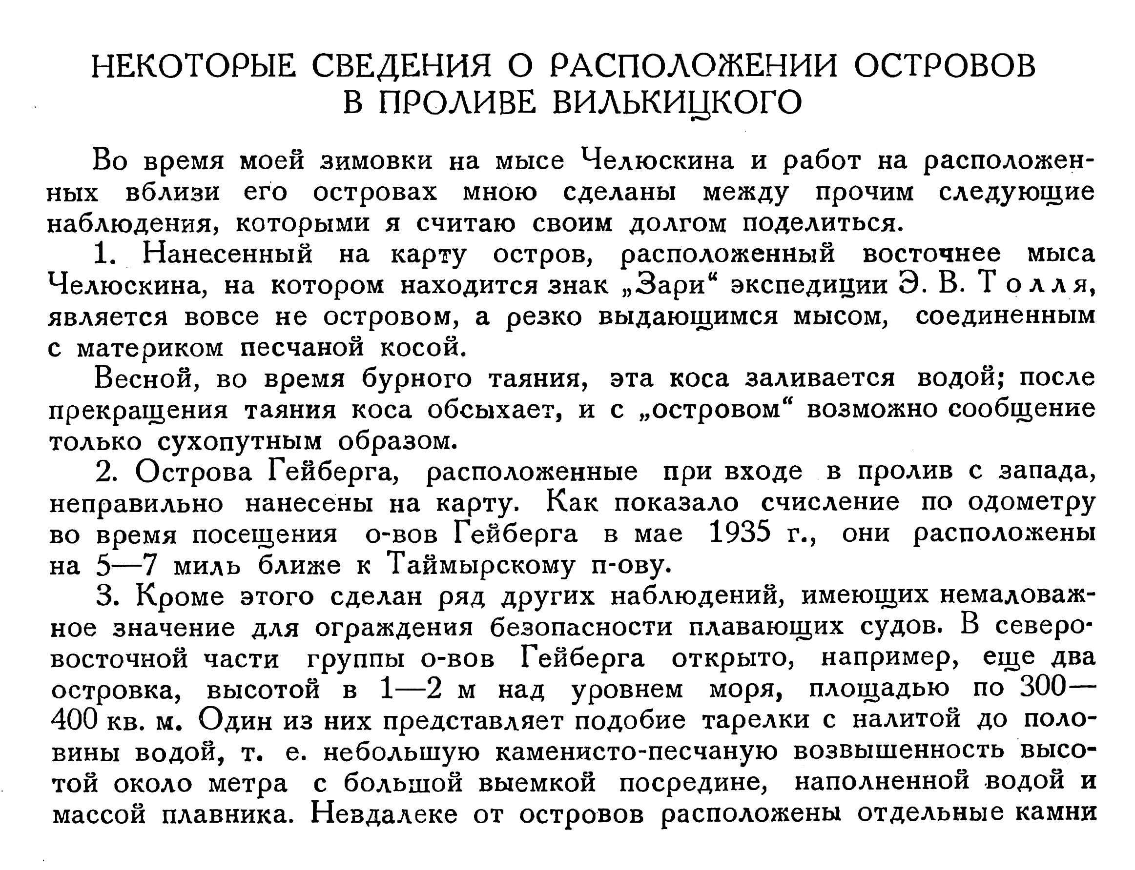2. Острова Гейберга, расположенные при входе в пролив с запада, неправильно нанесены на карту. Как показало счисление по одометру во время посещения о-вов Гейберга в мае 1935 г., они расположены на 5—7 миль ближе к Таймырскому п-ову.