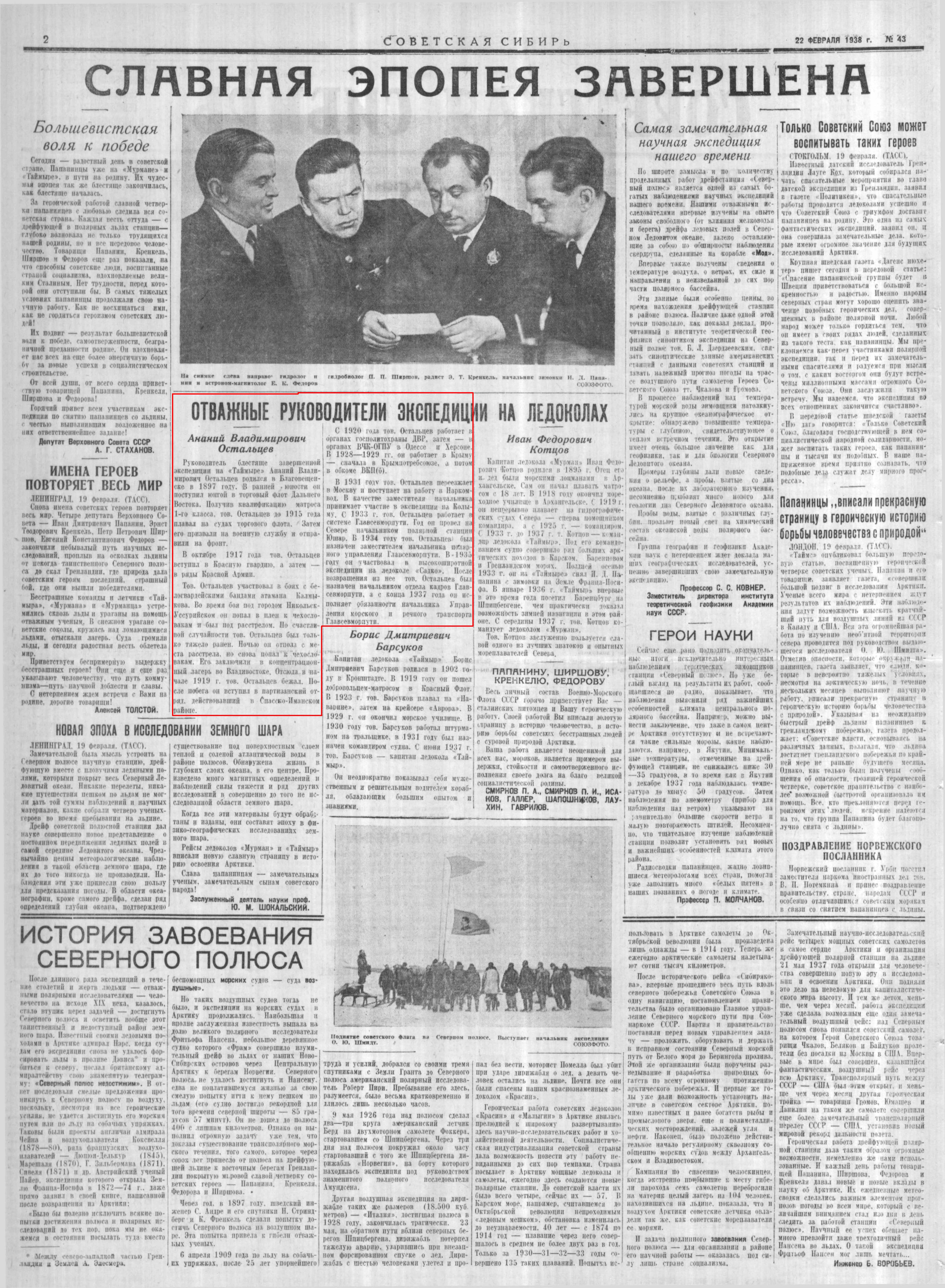 Отважные руководители экспедиций на ледоколах. №43 // Советская Сибирь : Газета. — Новосибирск: Советская Сибирь, 22 февраля 1938.