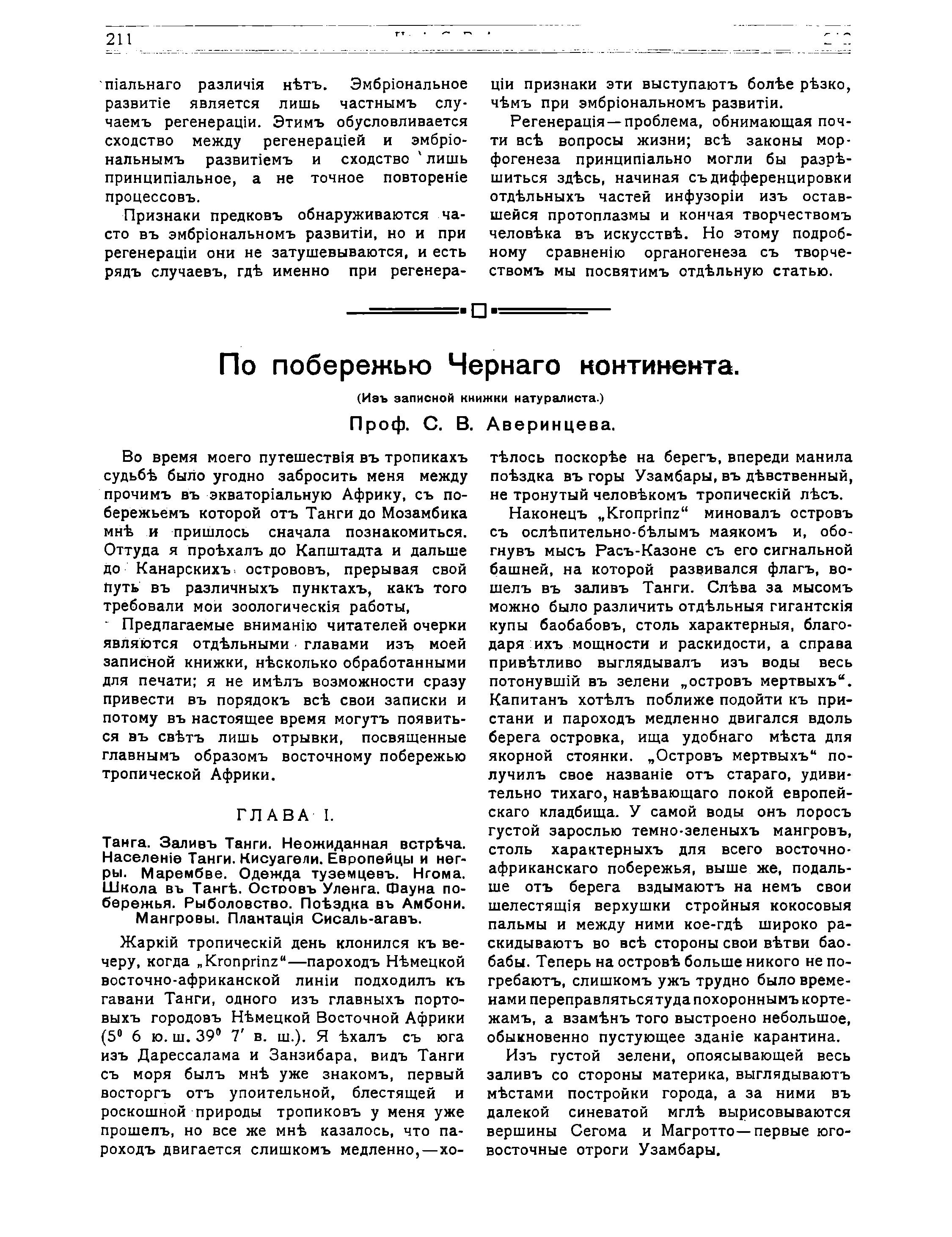 Зоолога Аверинцева привела в Африку… сломанная нога. В 1911 г. он получил стипендию для работы в Бетензоргском ботаническом саду на Яве и в Красном море; по дороге на «свой» остров сломал ногу, пытаясь выяснить причину свечения воды. Пришлось месяц лечиться в госпитале в Дар-эс-Саламе. Оказавшись в Восточной Африке, он использует редкую возможность побывать в биологическом сельскохозяйственном институте в Усамбарских горах. И опять не повезло — свалила новая болезнь. Тогда-то и решил остаться здесь подольше. Обследовал территорию нынешней Танзании, побывал на Занзибаре, а на обратном пути — вокруг Африки — почти во всех важных портах континента. Научный отчет опубликовал в 1913 г., а позже и научно-популярную статью в журнале «Природа» *), где проявил недюжинный литературный талант.
