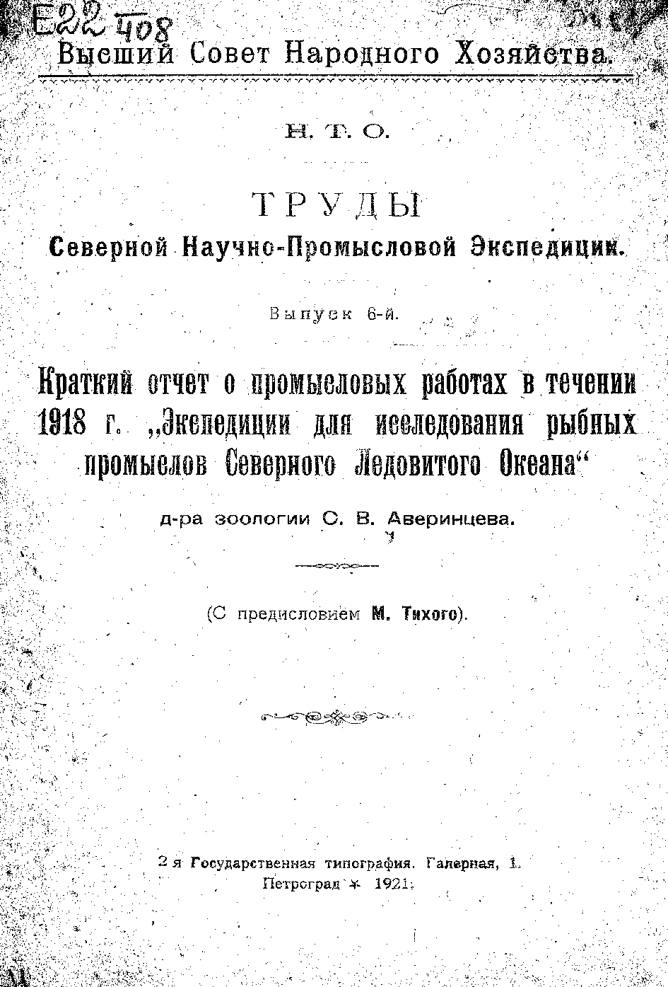 Аверинцев С.В. Краткий отчет о промысловых работах в течении 1918 г. "Экспедиции для исследования рыбных промыслов Северного Ледовитого океана" /[Соч.] д-ра зоологии С.В.Аверинцева; (С предисл. М.Тихого) ВСНХ. НТО [Редактор-издатель: Сев. науч.-промысловая экспедиция]. - Пг. : 2-я гос. тип., 1921. - 15 с., [1] л. к. ; 23 см. - (Тр. Сев. науч.-промысловой экспедиции ; Вып.6) viewtopic.php?f=7&t=6354&p=61202#p61202