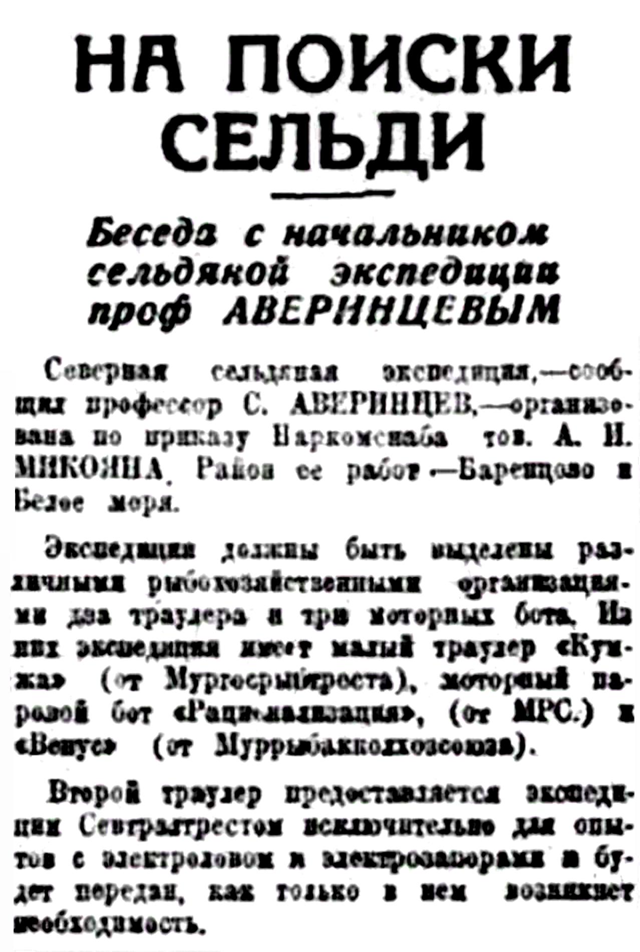 ЭКСПЕДИЦИЯ ДЛЯ ИЗУЧЕНИЯ СЕЛЬДИ, ее распространения в Баренцовом море по сезонам, определения запасов — организована Народным Комиссариатом Снабжения. Начальником экспедиции назначен проф. Аверинцев.