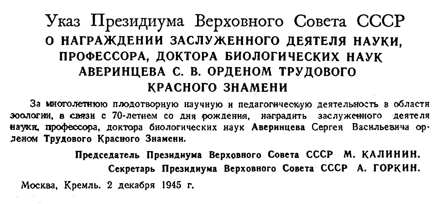 За многолетнюю плодотворную научную и педагогическую деятельность в области зоологии, в связи с 70-летием со дня рождения, наградить заслуженного деятеля науки, профессора, доктора биологических наук Аверинцева Сергея Васильевича орденом Трудового Красного Знамени.