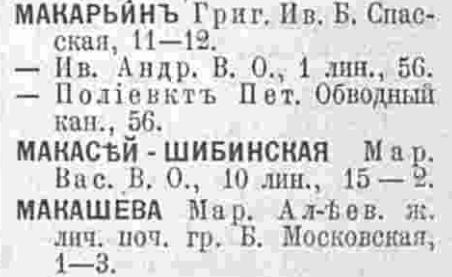 В книге 1923 года вновь появляется Кира Григорьевна М...-Шибинская, причем с двумя вариантами написания фамилии - Макасей и Мокасей, по адресу: В.О. 2-я линия, кв.41.