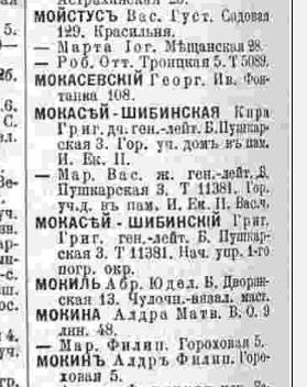 Мокасеи-Шибинские переехали на Б. Пушкарскую, д.3. Генерал-майор стал генерал-лейтенантом. Совместно с ними стала проживать дочь-Кира Григорьевна. Искомая особа - Владимир Григорьевич, так в справочнике и не проявился - служба, война, революция, наверное поэтому.