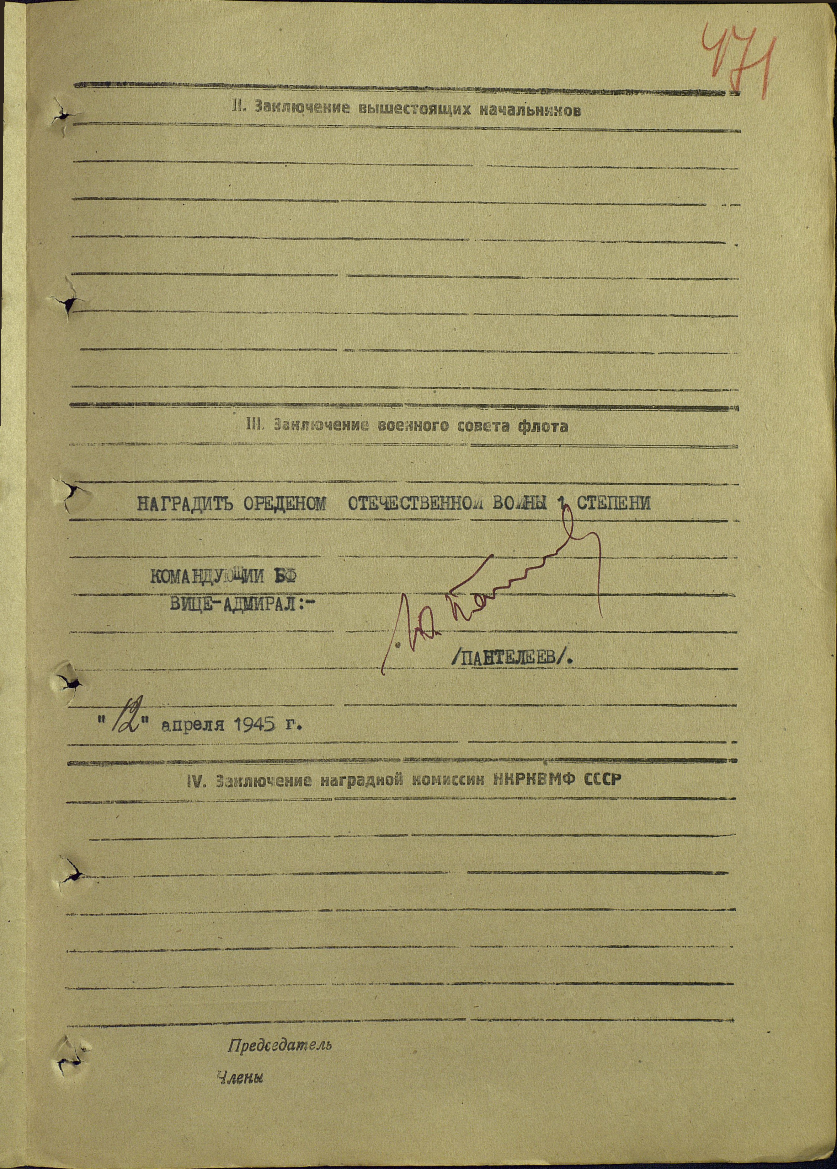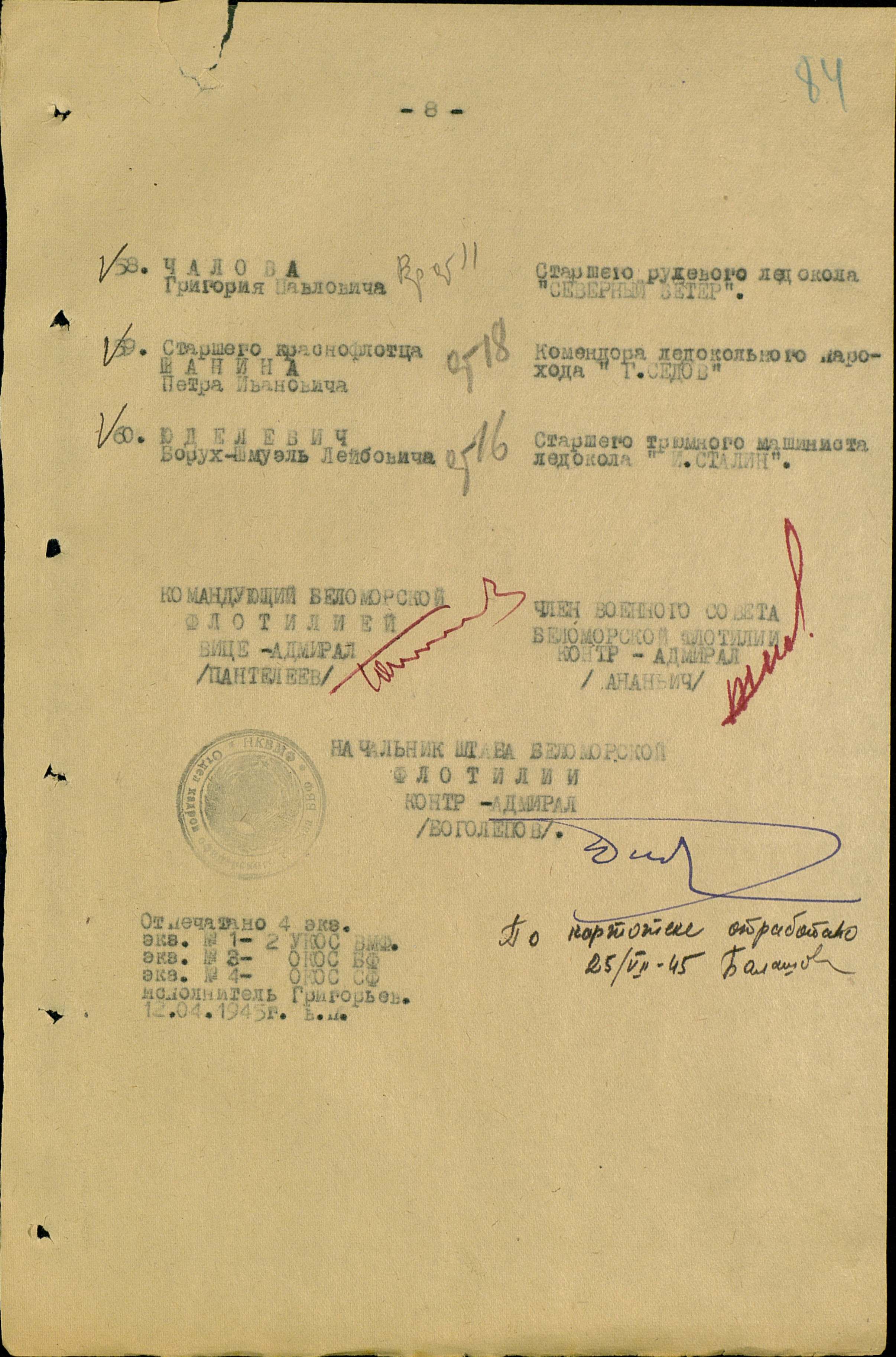 Приказ Командующего БВФ №020 от 12 апреля 1945 г. г. Архангельск.