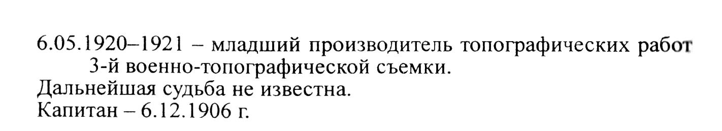 6.05.1920—1921 - младший производитель топографических работ 3-й военно-топографической съемки.