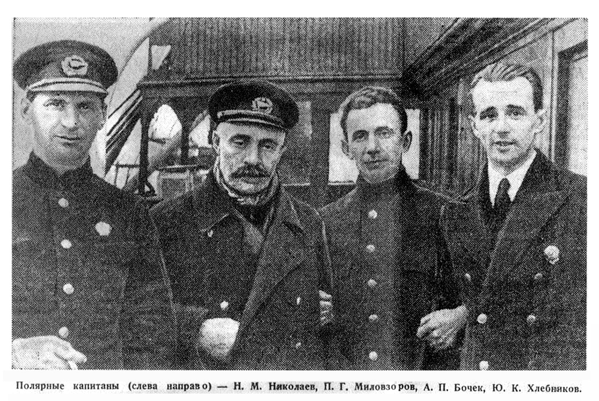 Полярные капитаны (слева направо) — Н. М. Николаев, П. Г. Миловзоров, А. П. Бочек, Ю. К. Хлебников.