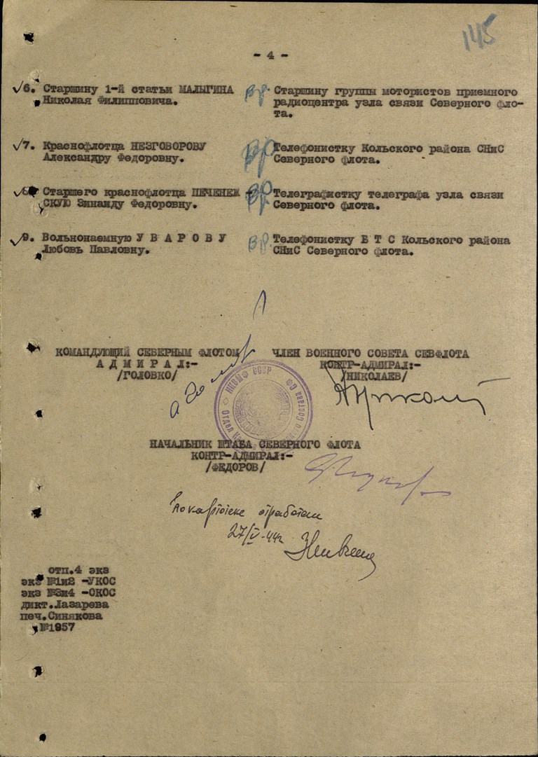 Приказ флота (флотилии) №: 34 от: 10.05.1944 СФ