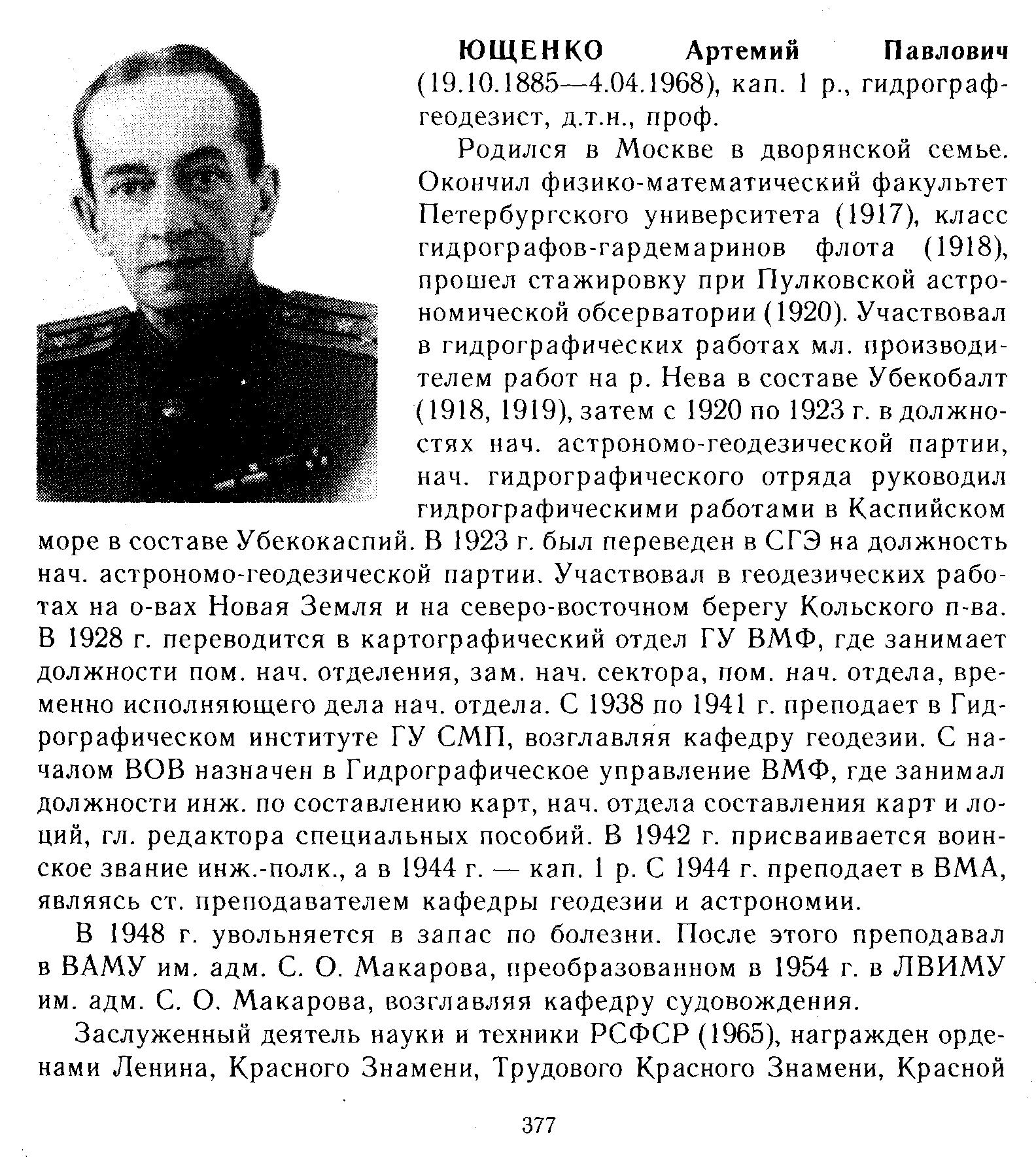 К сожалению даже в таком солидном издании не обошлось без ошибок-опечаток. Год рождения А.П. Ющенко (1885) указан не верно. Не мог молодой мужчина дворянского происхождения до тридцати лет околачиваться по гимназиям-университетам, не послужив до этого во благо Государя и Отечества в армии или флоте. Не усмотрел эту досадную неточность и уважаемый Г.П. Аветисов в своем широко известном интернет-ресурсе "Имена на карте Арктики" http://www.gpavet.narod.ru/juschenko.htm (исправлено)