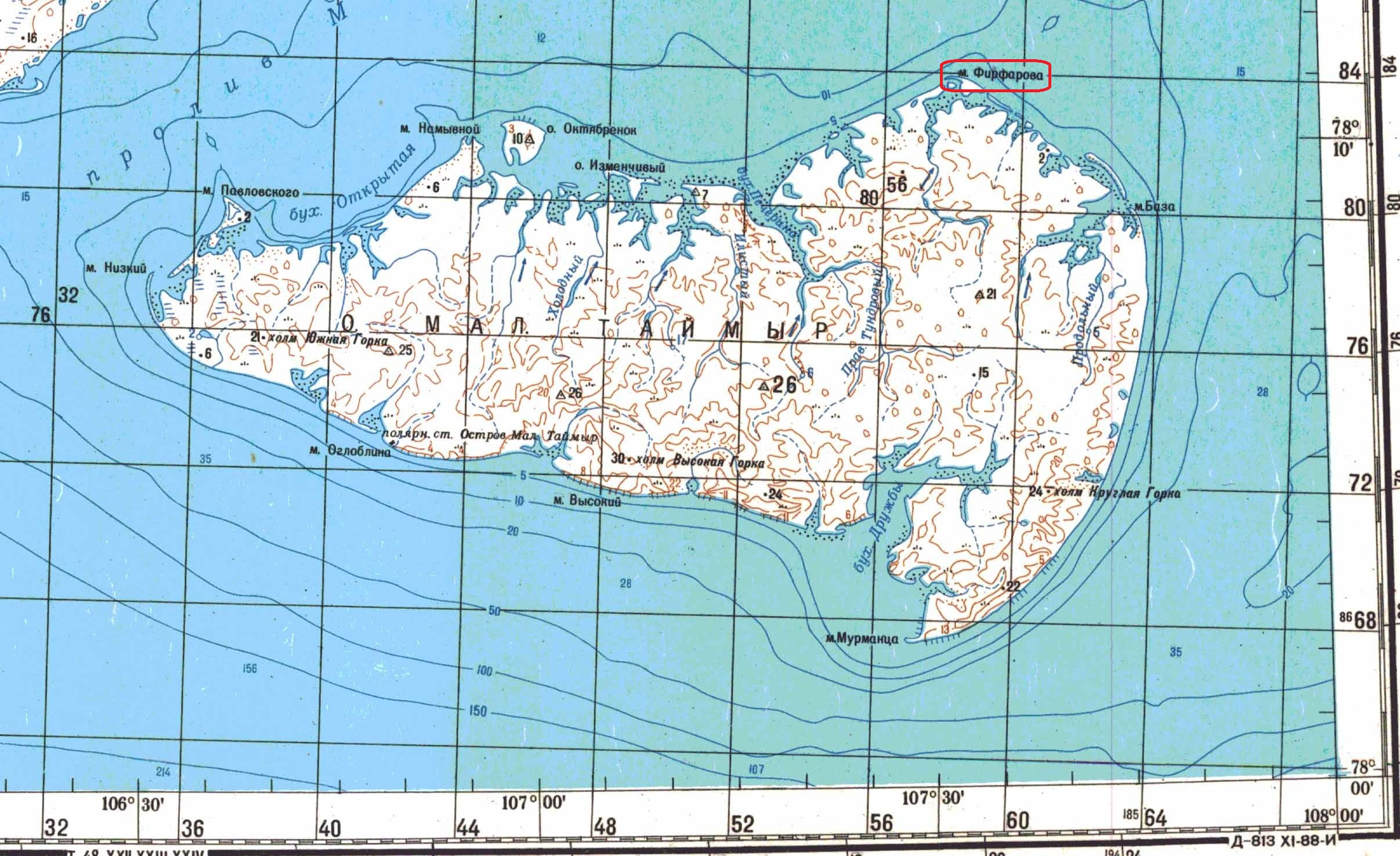 Фирфарова, мыс, море Лаптевых, о. Мал. Таймыр. Открыт в 1913 г. Гидр. эксп. СЛО на л/п "Таймыр" и "Вайгач". В 1914 г. назван по фамилии судового механика ст.л-та Аркадия Гавриловича Фирфарова.