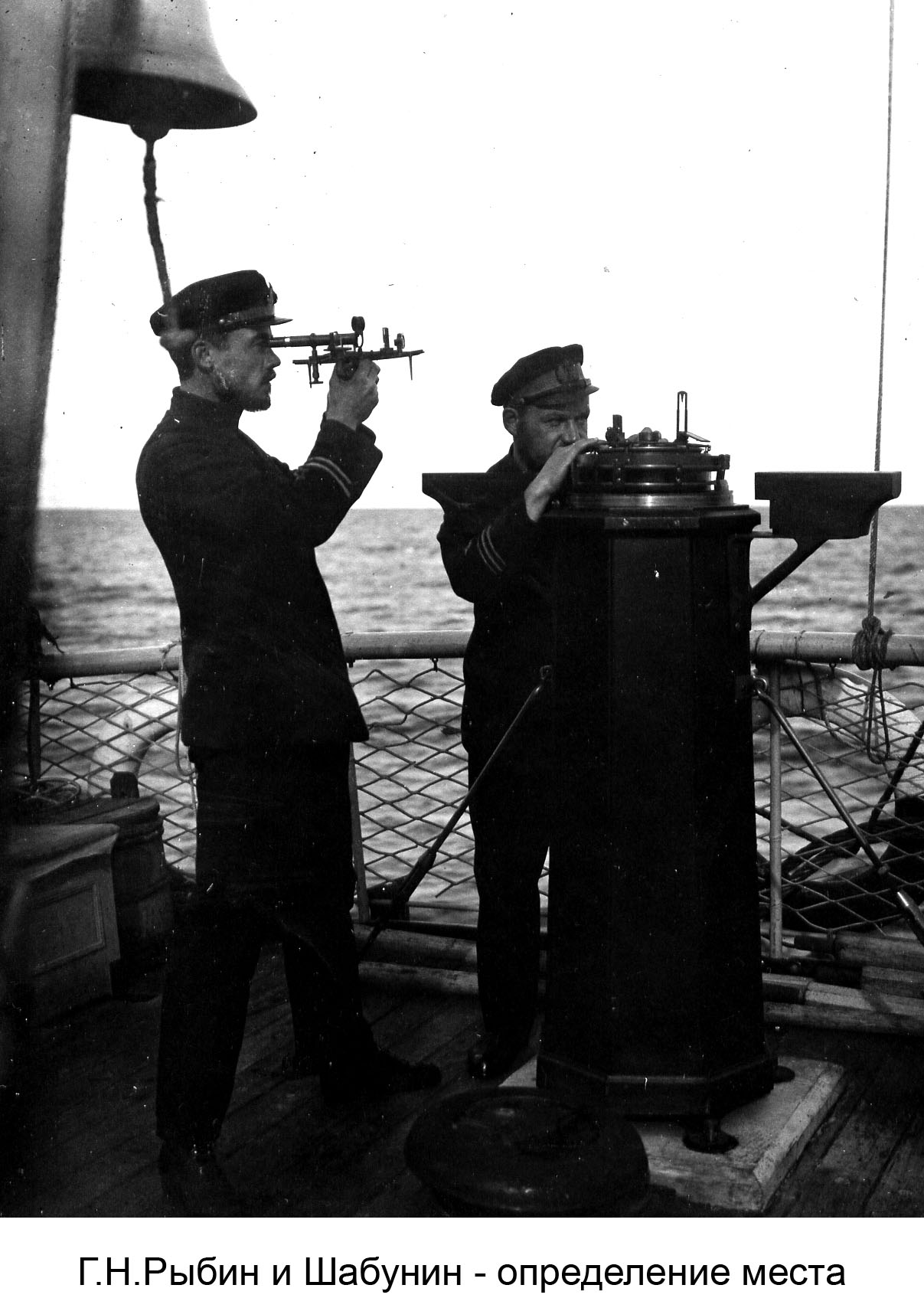 слева командир "Прибоя" Шабунин, справа астроном Воробьев, стоят Рыбин и Ежкин (август 1928 г. )