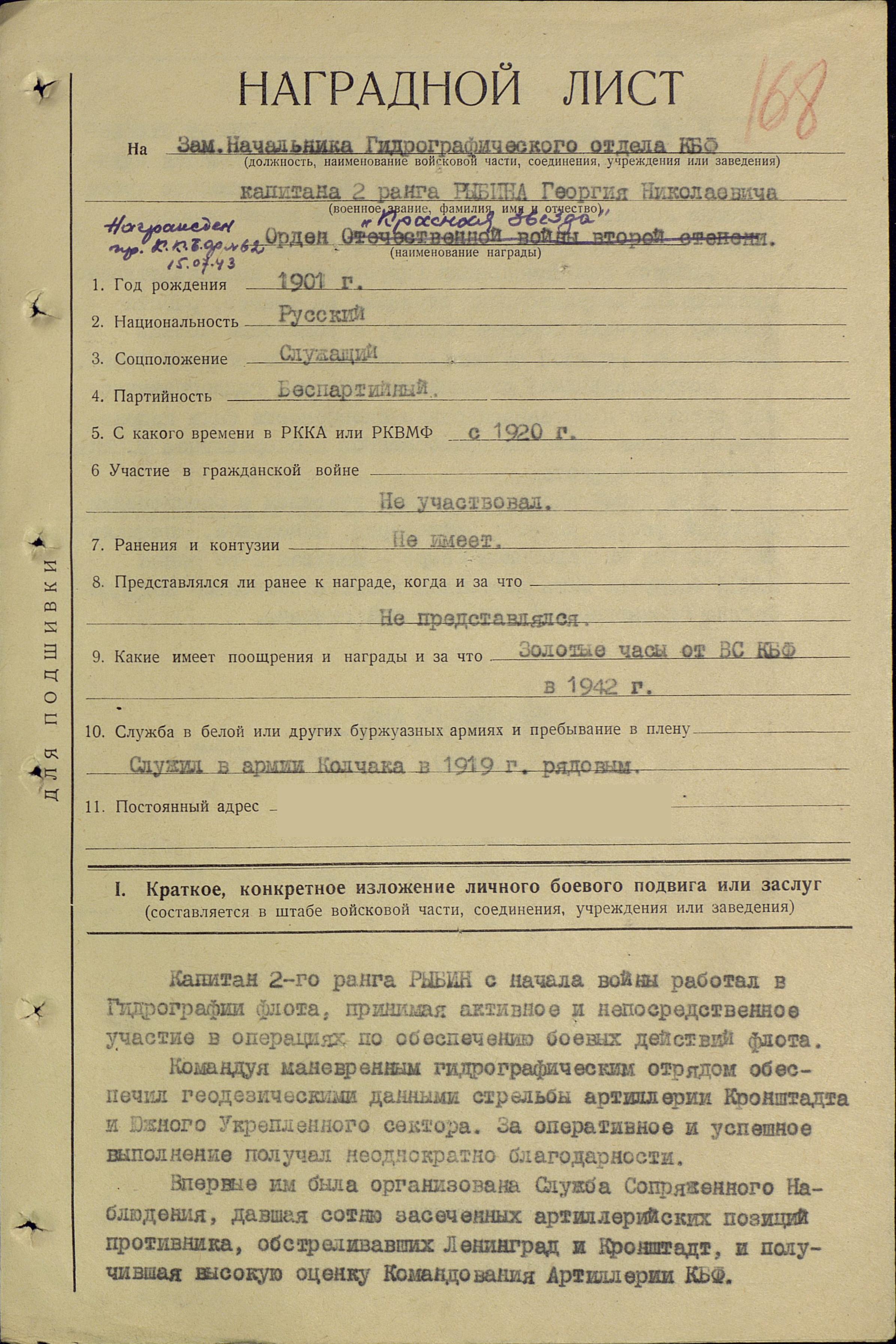Во время блокады Ленинграда очень большую роль сыграли гидрографы при обеспечении стрельб береговой и корабельной артиллерии. На гидрографов возлагалось точное геодезическое определение позиций наших корабельных, береговых, железнодорожных и зенитных батарей, составление батарейных формуляров и других документов для обеспечения стрельбы, а, главное, разведка батарей противника путём их инструментальной засечки [1]. Для этой цели были сформированы 2 маневренных гидрографических отряда. Одним из них руководил капитан 3 ранга Г. Н. Рыбин. Один из пунктов для засечки немецких батарей находился на куполе Исаакиевского собора. В ноябре 1941 за отличную работу по геодезическому обеспечению артиллерии КБФ, участвовавшей в обороне Ленинграда, капитан 2 ранга Г. Н. Рыбин был награждён ценным подарком — карманными швейцарскими часами (Они переданы на хранение в музей Главного управления навигации и океанографии Министерства обороны).