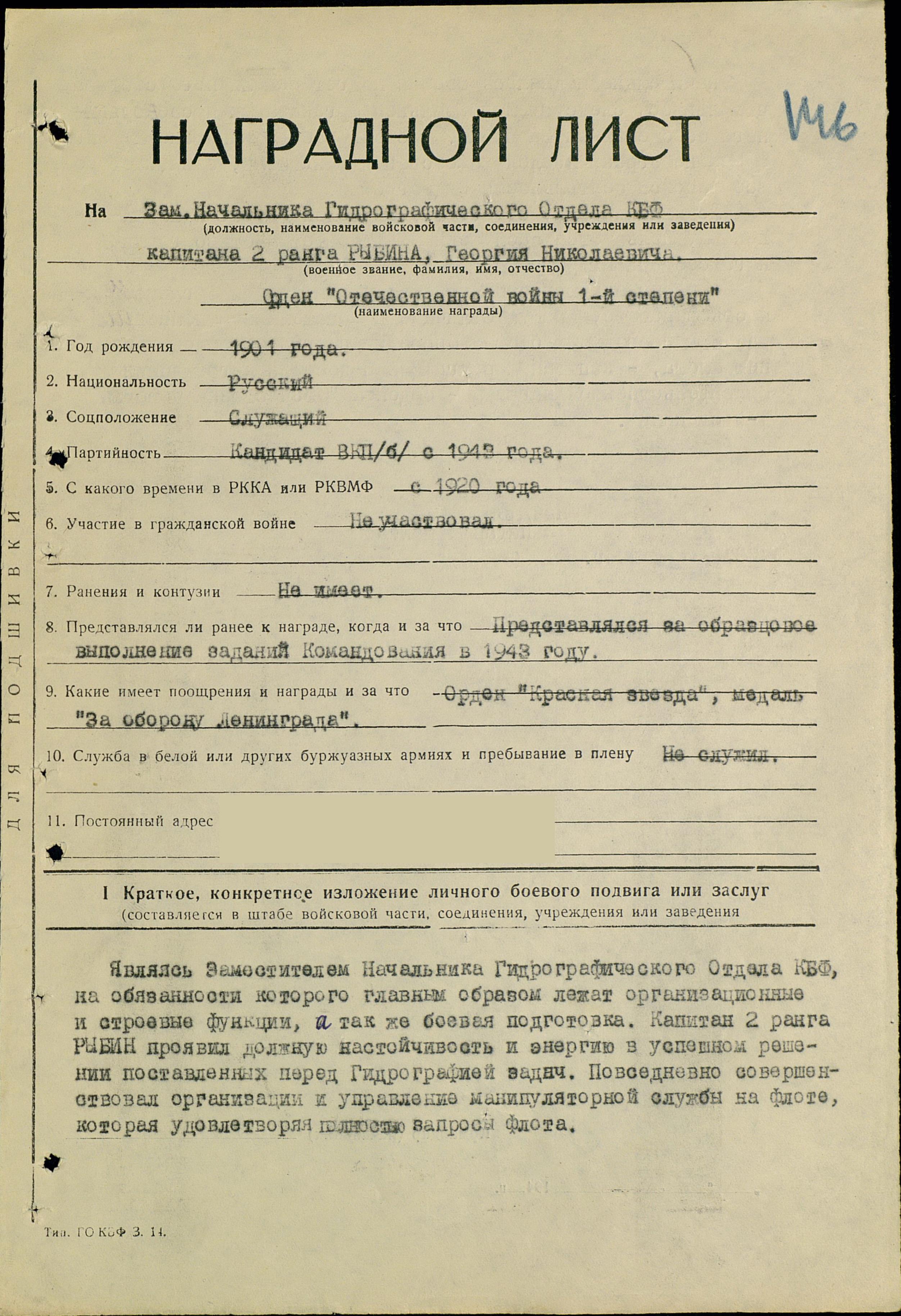 Наградной лист: фонд 3 опись 1 единица хранения 861