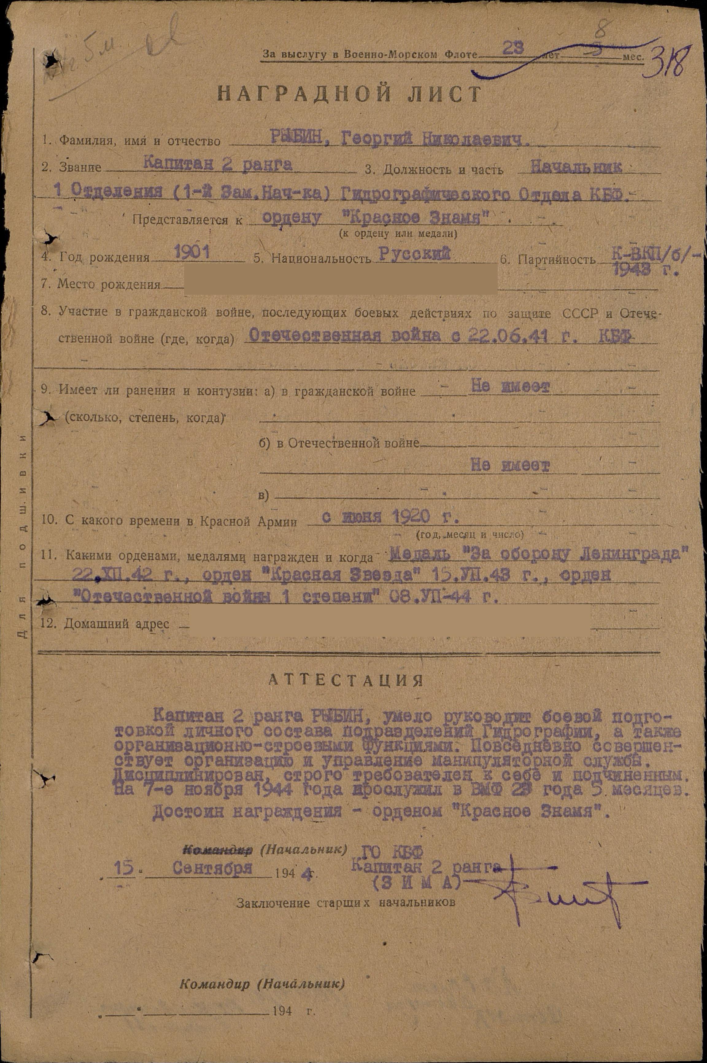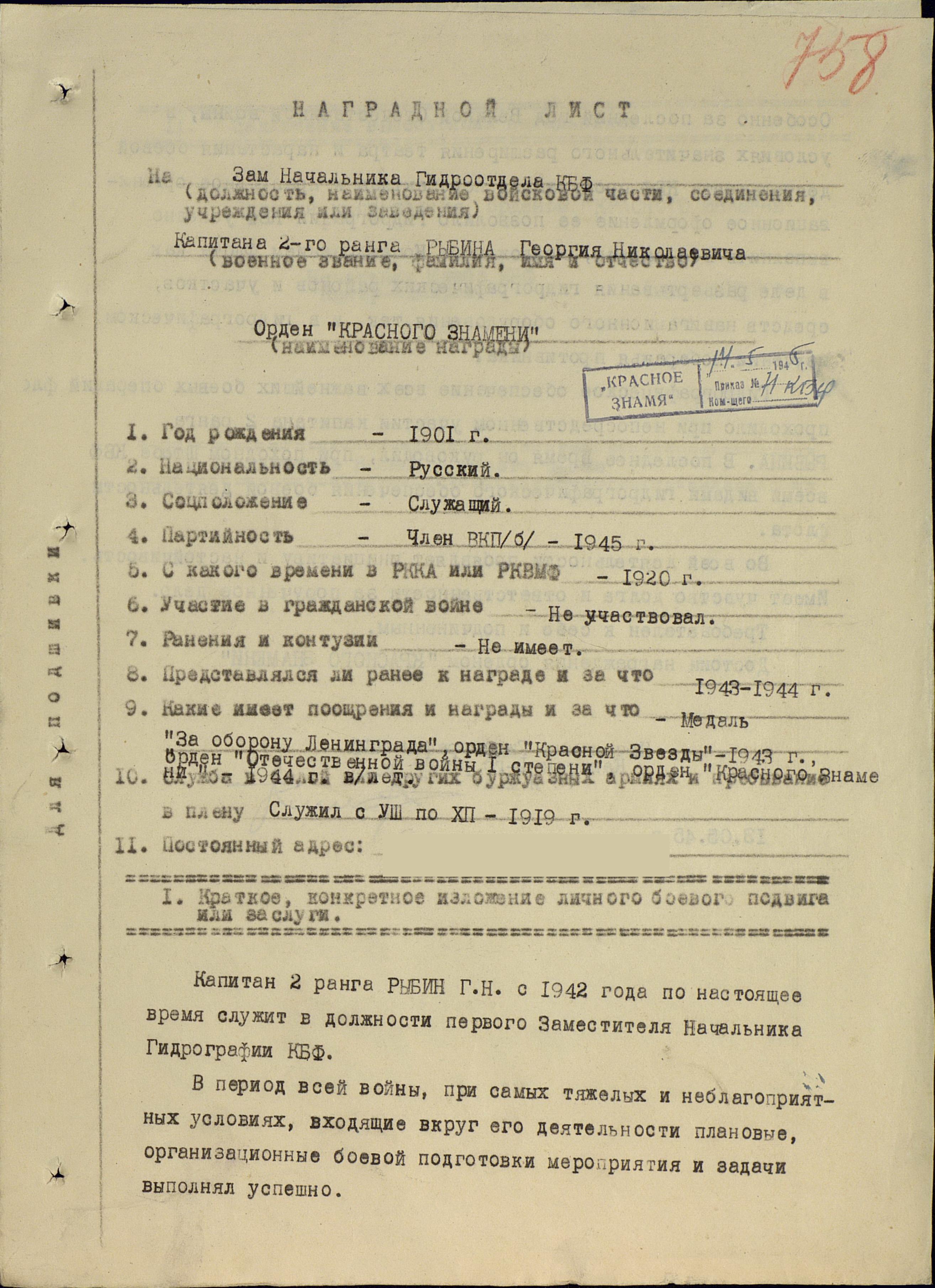 Наградной лист: фонд 3 опись 1 единица хранения 1295