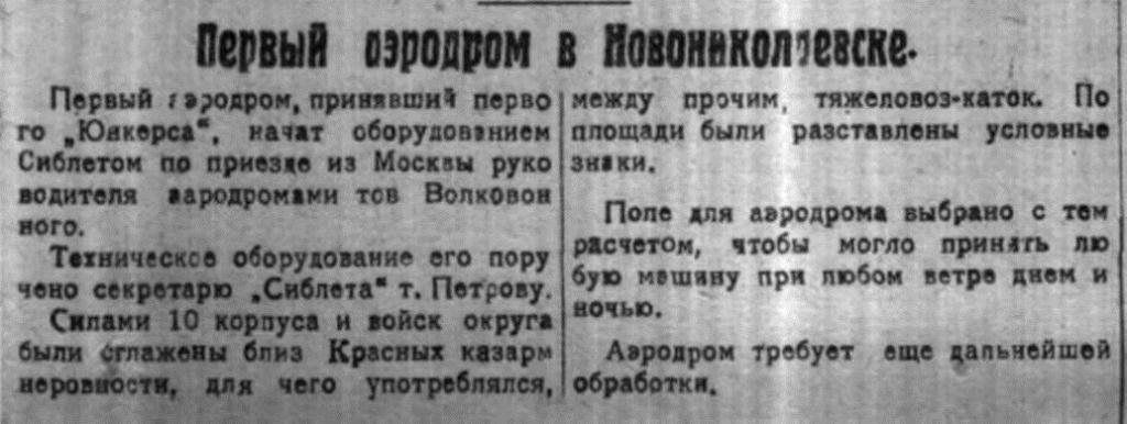 Первый аэродром, принявший первого "Юнкерса", начат оборудованием Сиблетом по приезде из Москвы руководителя аэродромами тов.Волковойного.